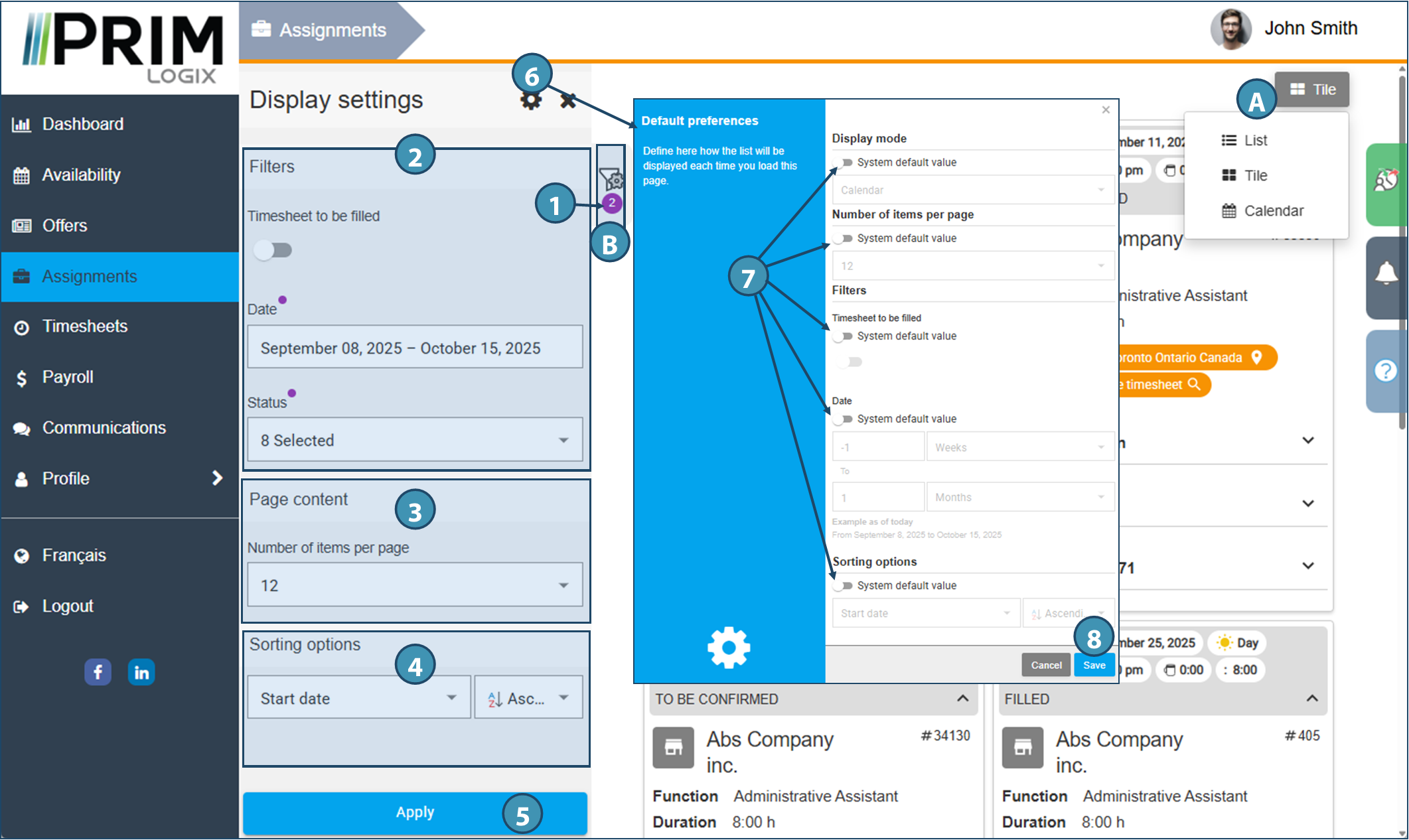 In addition, the settings tab on the left of the page(B) allows the user to modify the display settings of each page. A dot on the icon indicates that some filters are currently applied to the page(1).