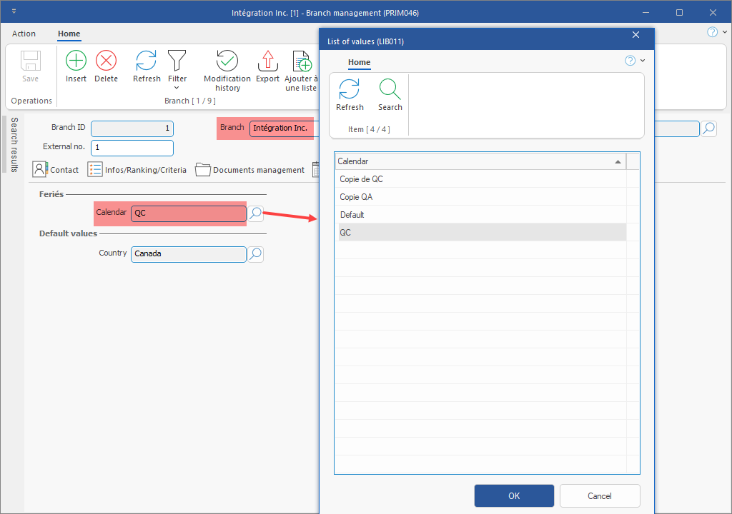 Finally, in candidate's files, the Default branch calendar will be the default calendar. However, it is possible to select another existing calendar as default. (See image)
