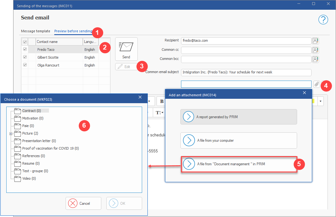 27.Emails and attachments: It is now possible to attach files from Document management in PRIM. (See image)