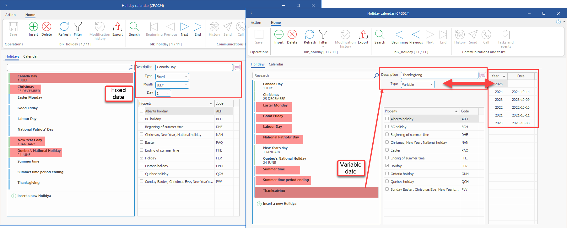 5.Holiday calendar redesigned: There is now two types of holidays: fixed (fixed date, which is the same from year to year) or variable (the date is not the same from year to year, and as such, must be specified each year). (See image)