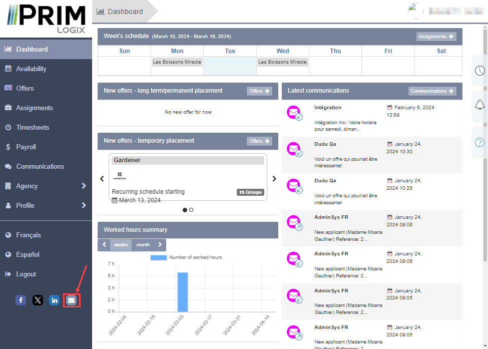 7.Web portal (candidate and client): A new icon with a link to send an email to the agency has been added to the bottom of the left panel of the client and candidate Web portals. (See image)