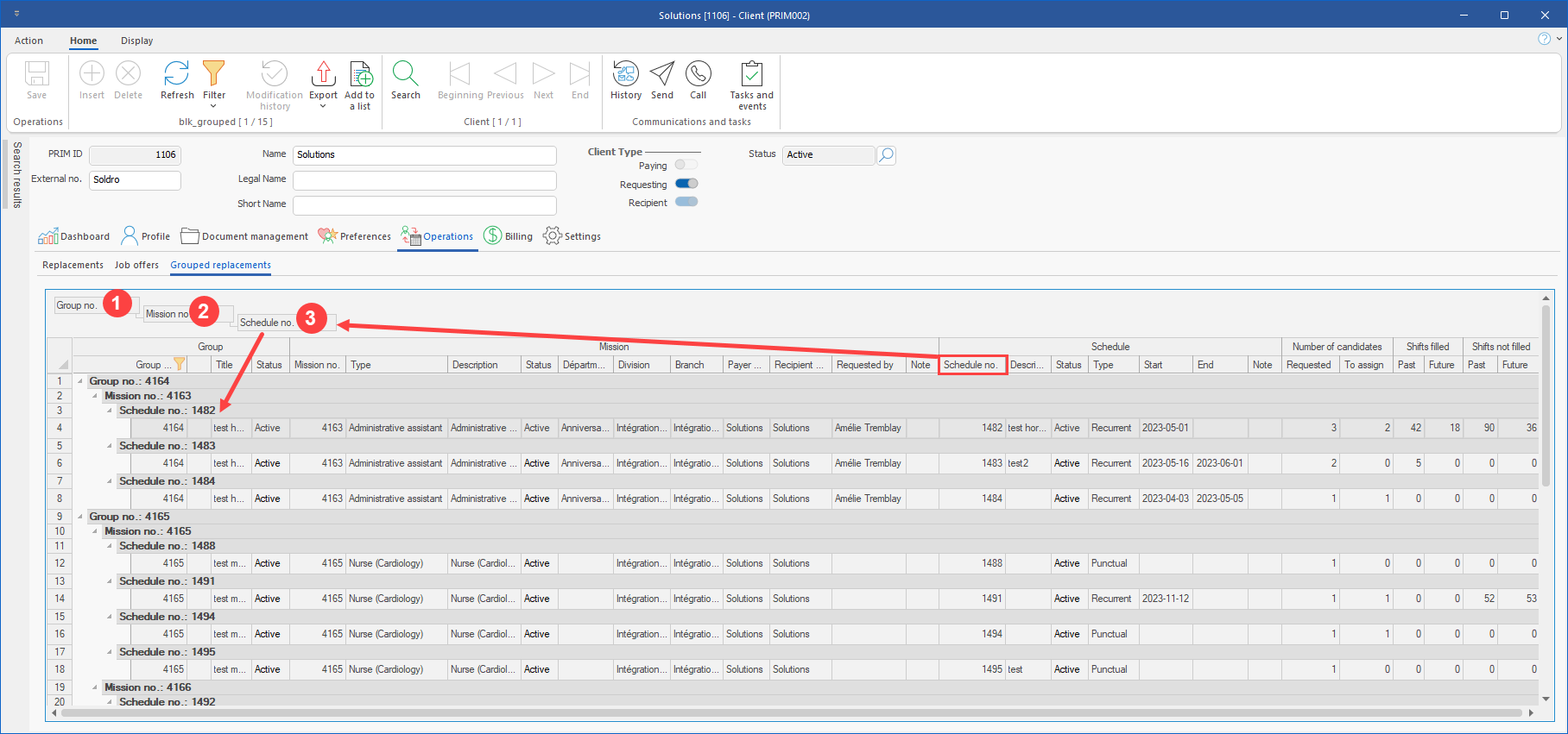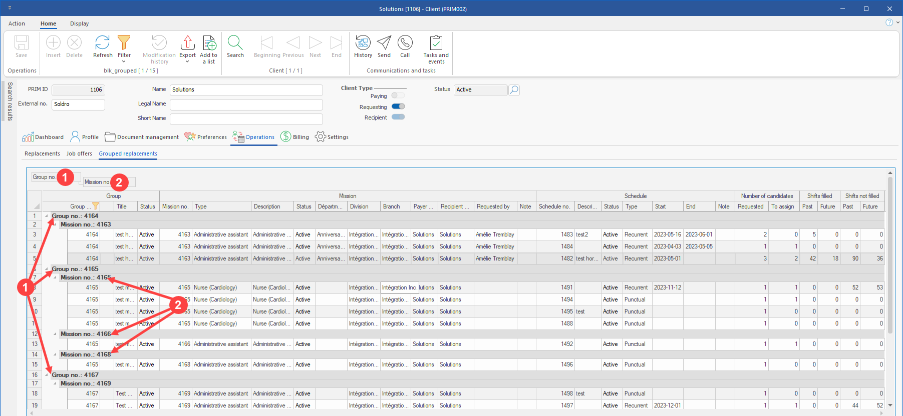 1.Client file : In Operations tab, a new sub-tab has been added to provide a global overview of grouped shifts only. By default, the grouped shifts are sorted by Group, then by Mission. (See image)