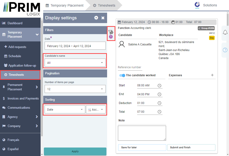 8.Web portal (candidate and client): It is now possible to filter using criteria in many lists, depending on PRIM configuration.