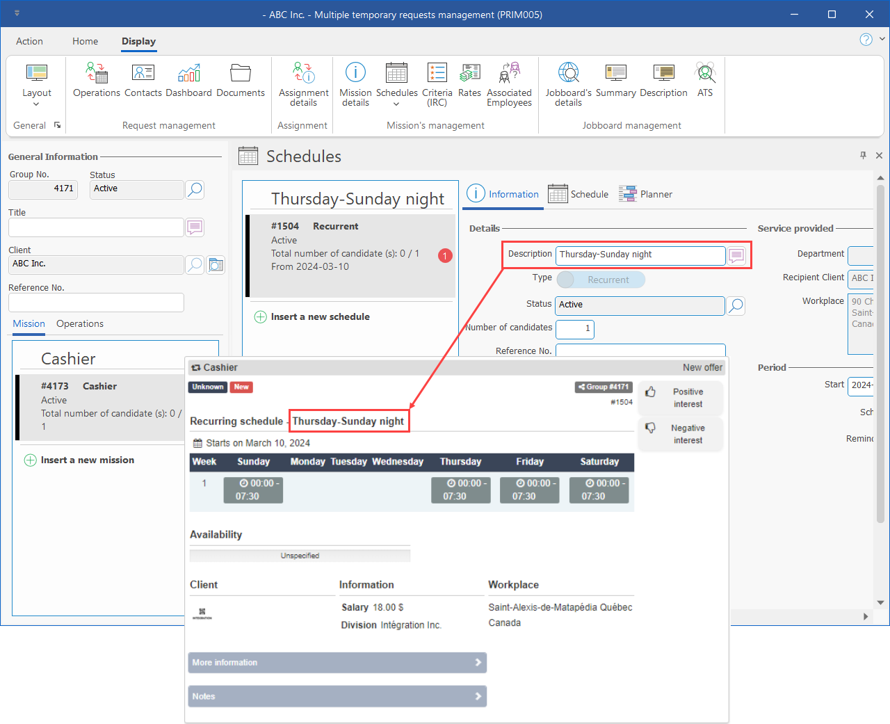 18.Grouped shifts, Web portal and job board: When a grouped shifts request is displayed on the Web portal or job board, the title/description for the schedule, if applicable, is now added under the mission's title. Furthermore, the schedule is also displayed. (See image)