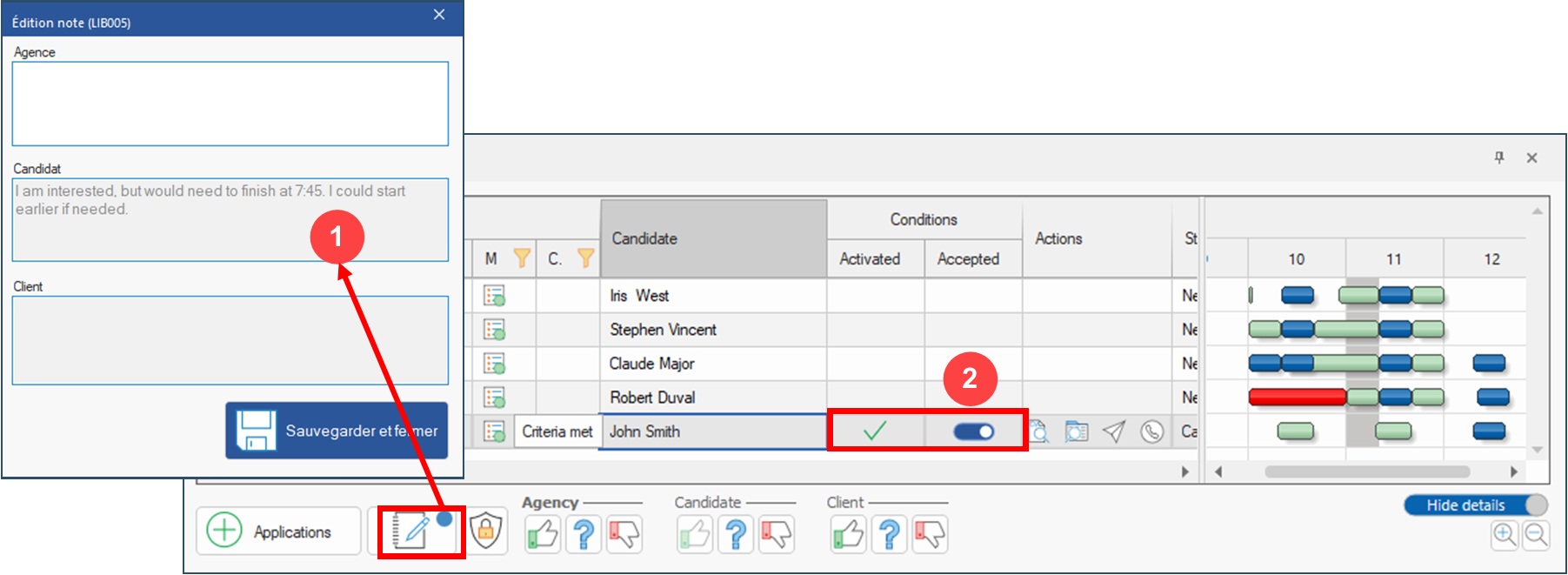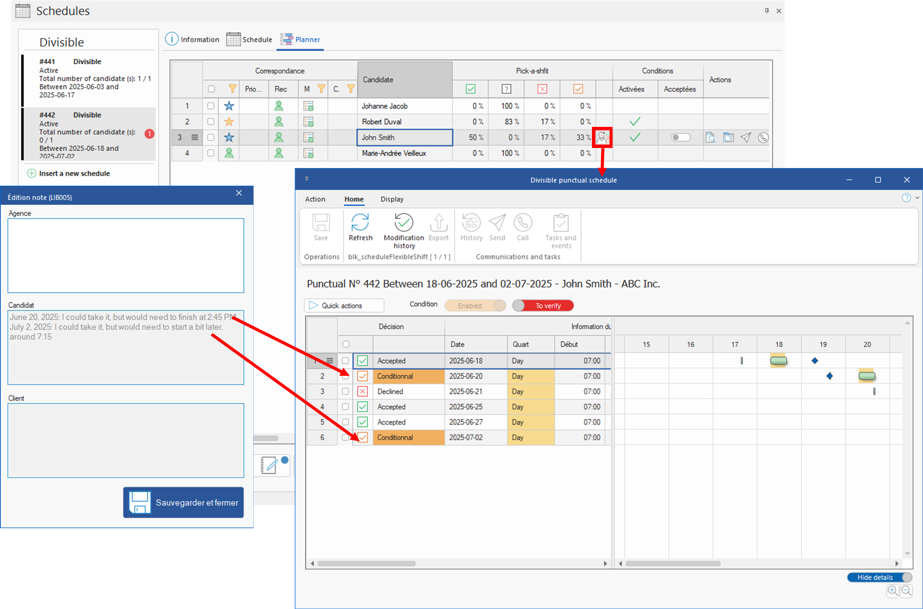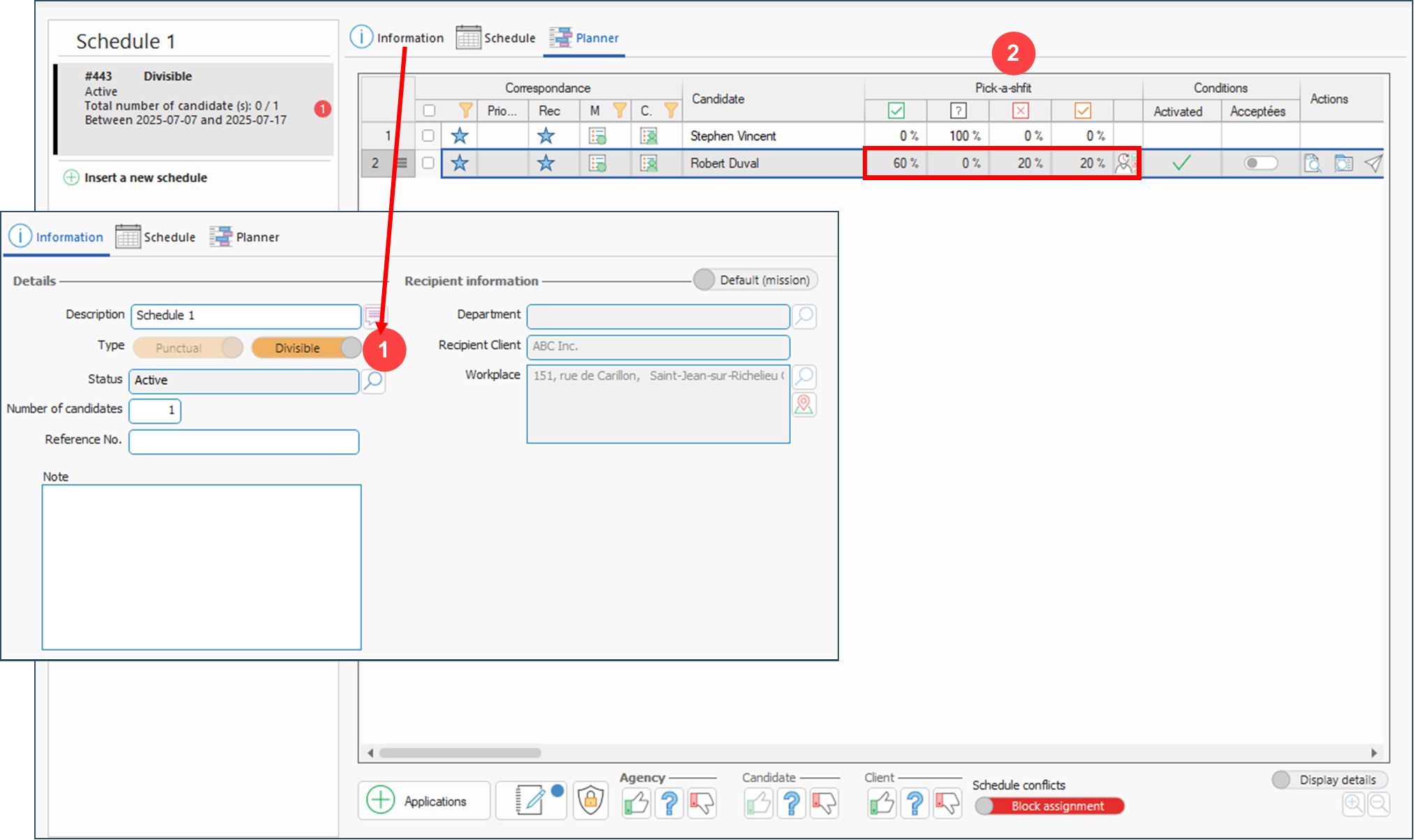 When this mode is activated on a schedule(1), columns are added to the planner, indicating the percentage of shifts accepted, accepted with conditions or refused, as well as the button for accepting or refusing conditions(2). (See image)