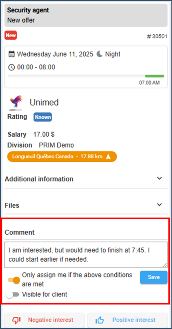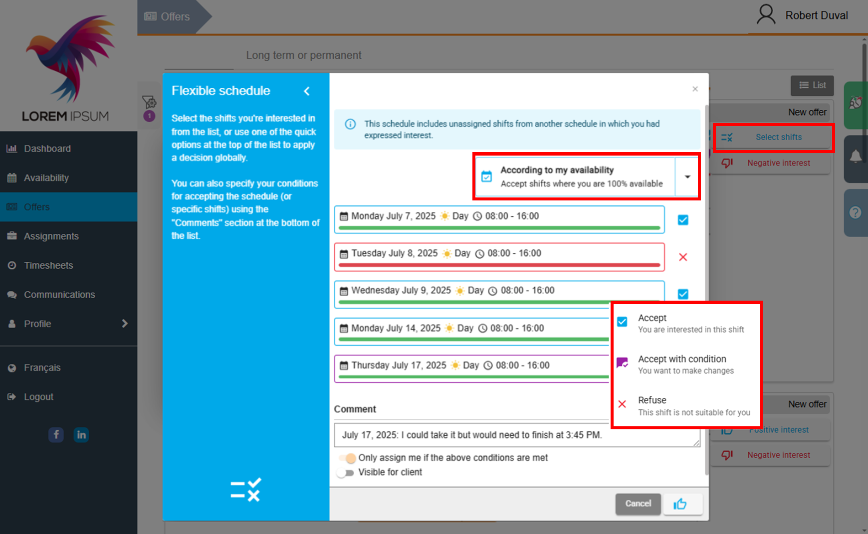 2.Web portal for candidates and addition of conditions for temporary requests : A new feature allows candidates to add conditions to their acceptance of an assignment. Candidates can now specify their expectations or restrictions in a note and activate a switch to indicate that this note is a prerequisite for their acceptance of the assignment.. (See image)
