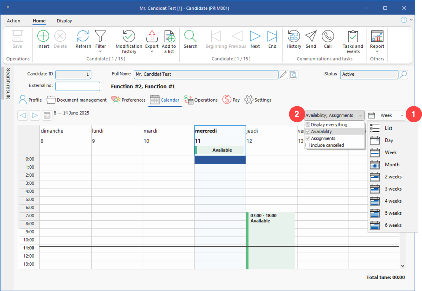 7.Calendars and display menus: In the various windows offering calendar or list views (e.g., the Calendar tab in the Candidate and Client windows, as well as the Operations pane and grouped request punctual schedules), a new drop-down menu has been added to select the view.(1) This menu offers the following options: