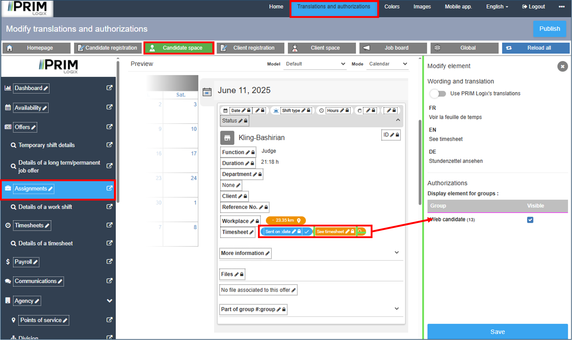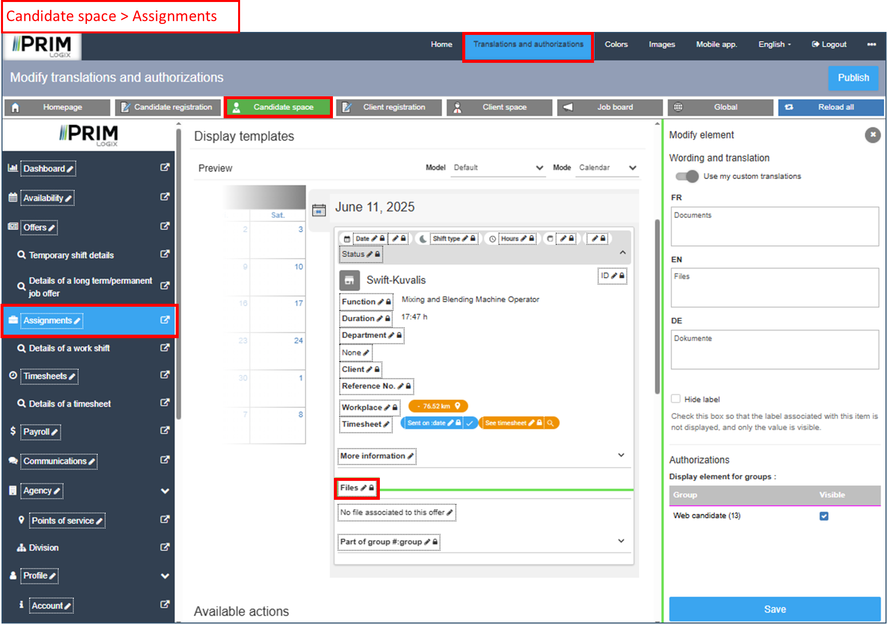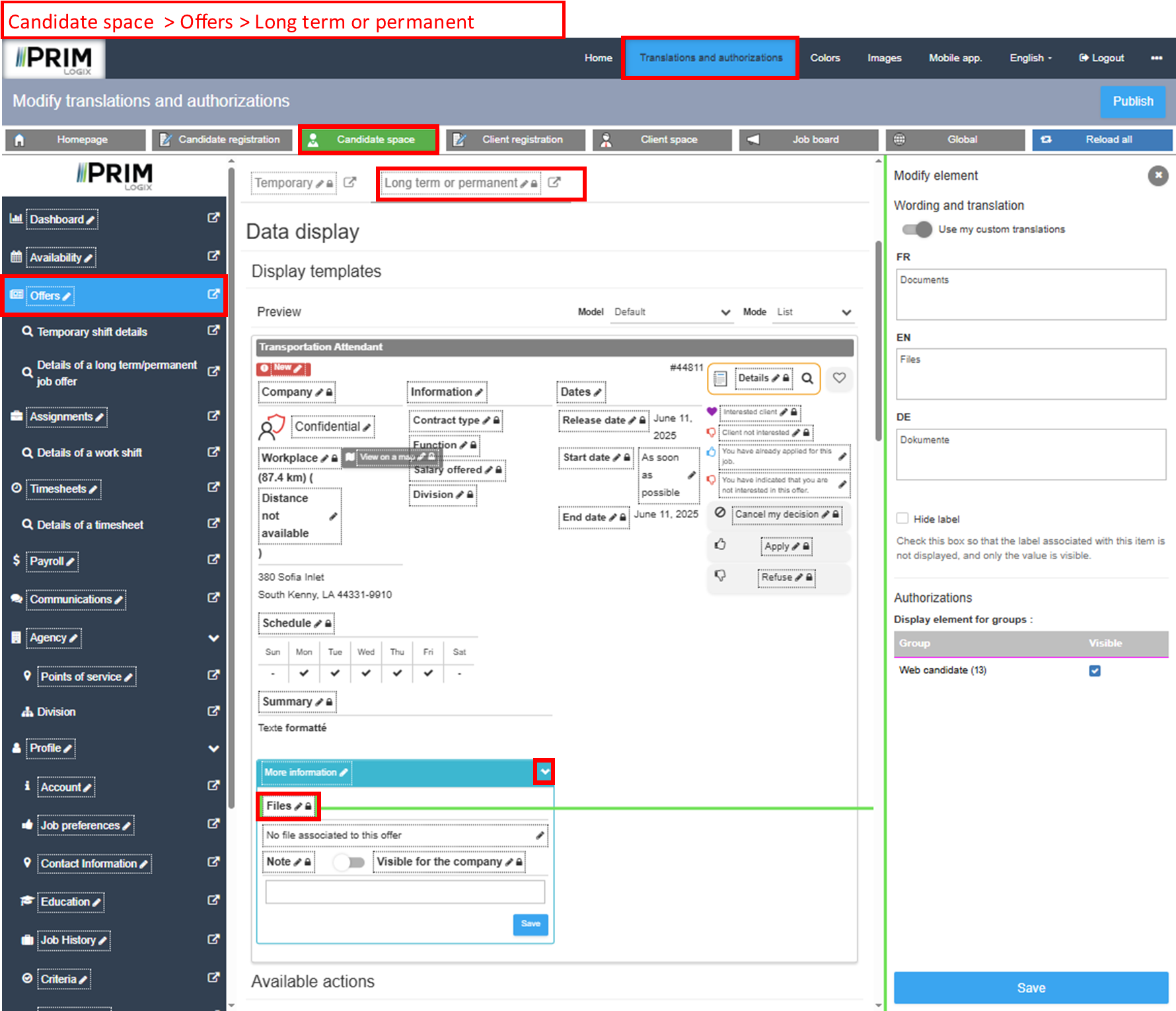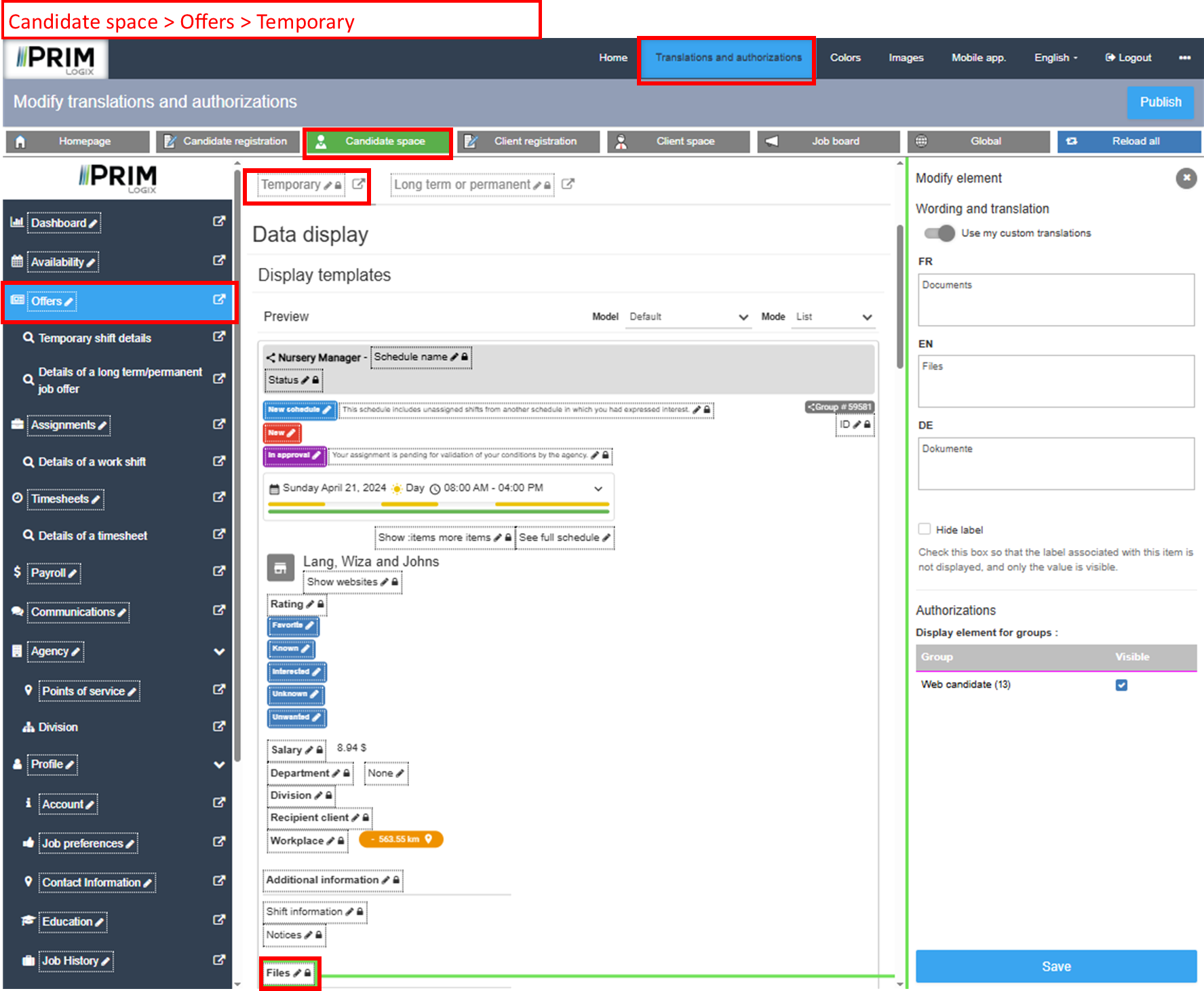 If you search for documents in a shift, mission or job offer via PRIM, you will not see documents from other entities, only those directly related to the shift, mission or job offer. Documents from other entities will only be visible on the Web or in the corresponding entity.