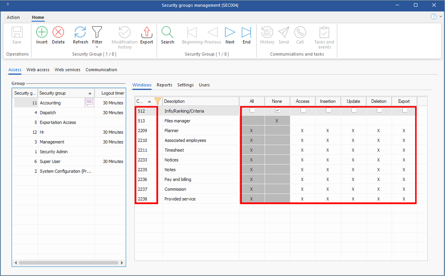 9.Security groups and users: A new Users tab has been added to the Security Groups Management (SEC004) window. This tab allows you to quickly view all users associated to a security group for each company, as well as to add or remove users from a security group. (See image)