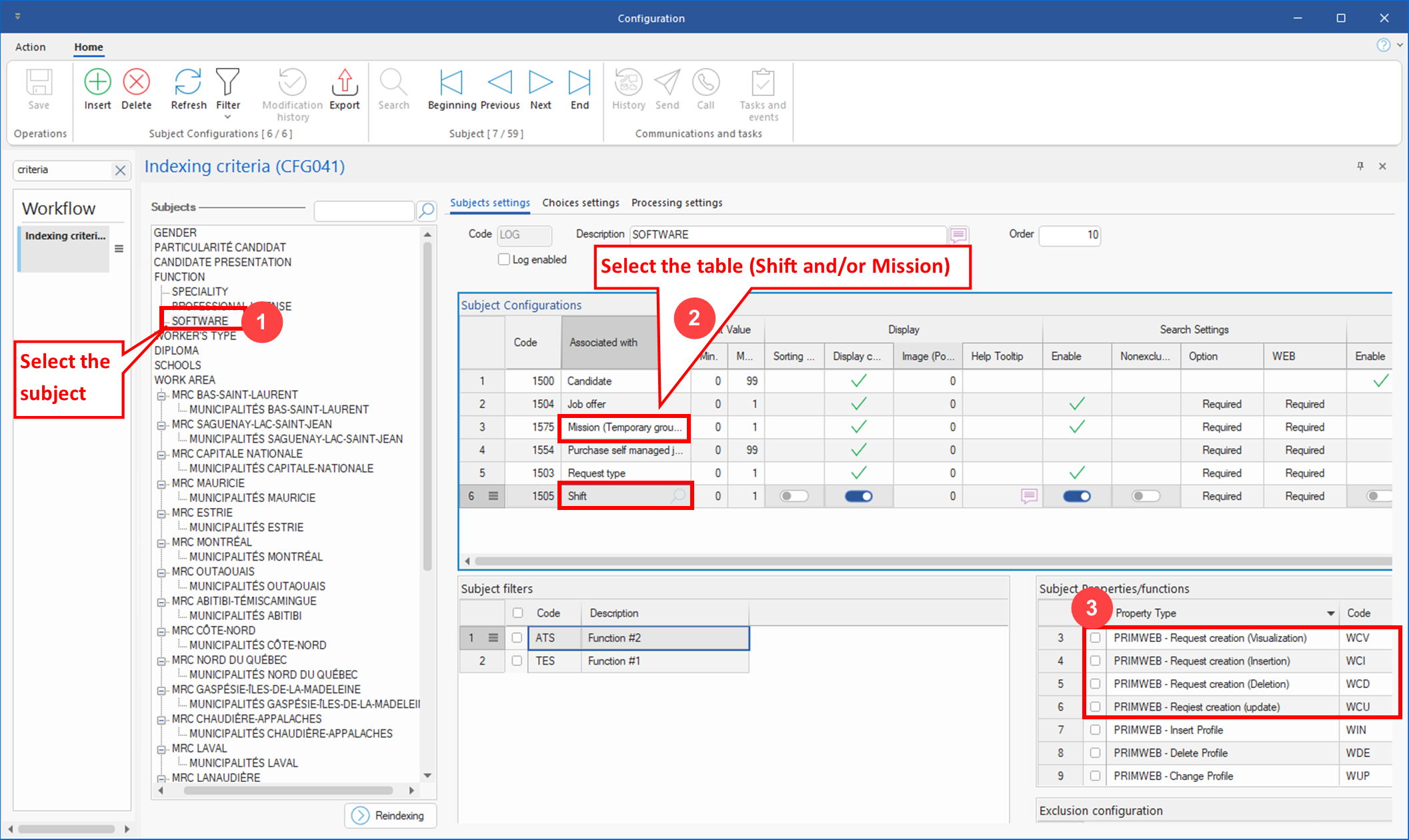 Client action: For a criterion to be visible on the Web, whether associated with the request type or simply available in search, the subject properties relating to Web display must be checked in the Indexing Criteria pane of the configuration window in the Shift and Mission tables. (See image)