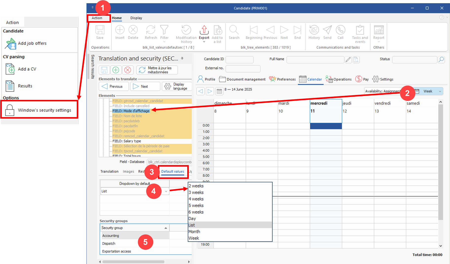 8."Calendar/List" views and default display mode: It is now possible to specify a default display mode by security group in the various locations with these display types: Calendar tab of Candidate and Client windows, Operations and ad-hoc schedules pane of grouped requests, To-do tasks (WKF004) and Events and tasks management (WKF011) windows. If necessary, ask our team for help. (See picture)