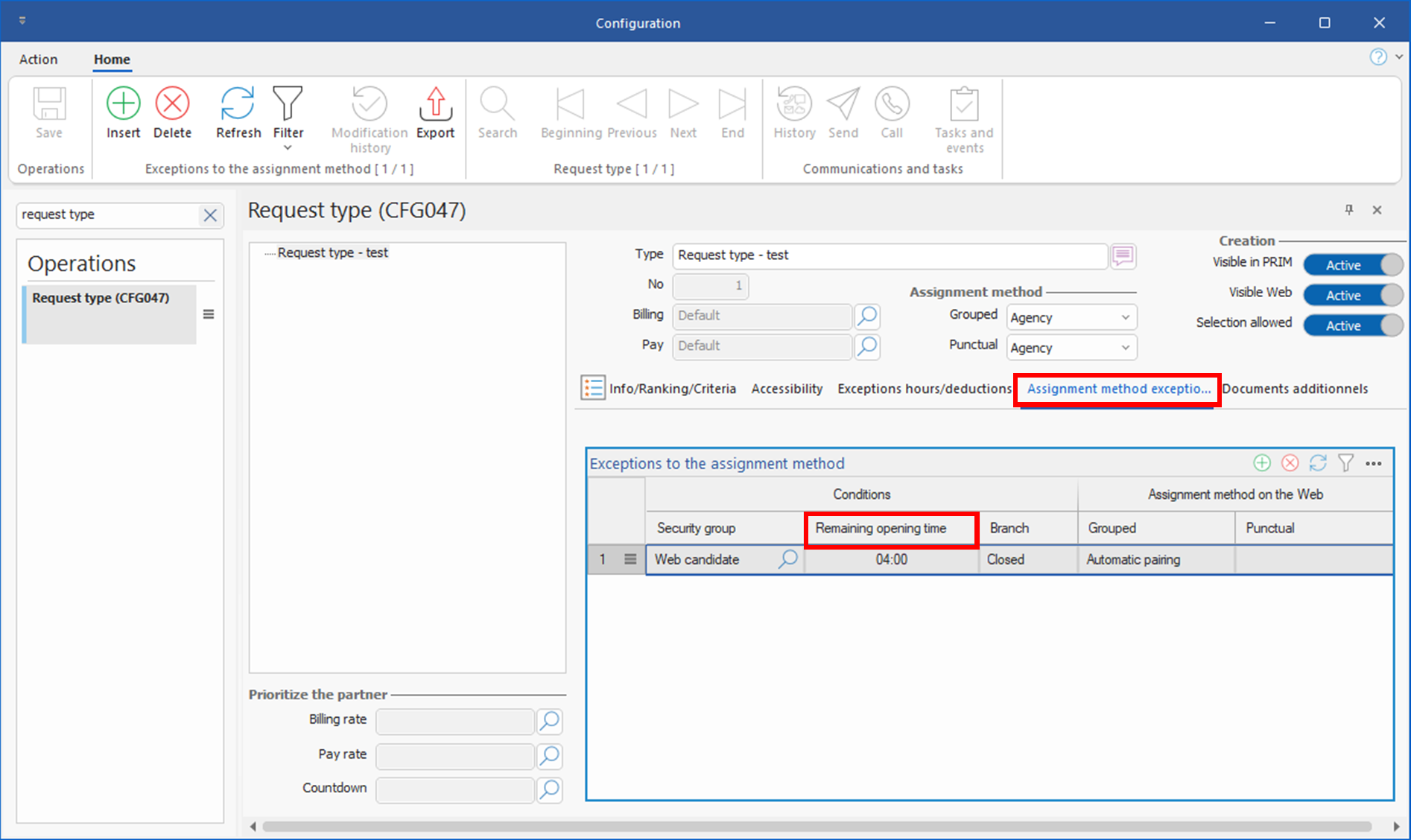 25.Request types - assignment methods and exceptions: In exceptions to the Web assignment method, the calculation performed for the Time remaining before start option has been modified to take account of agency opening hours only. The wording has also been corrected to reflect this new reality, and now reads Opening time remaining. This means that the calculation based on the value indicated in this field will consider the agency's business hours. (See image)