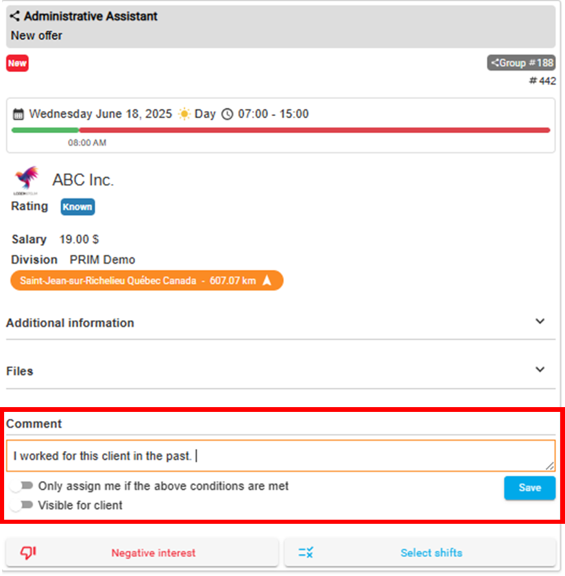 14.Web portal candidate / Offers: The proposal tile for candidates has been improved: notes added are now displayed directly in the tile, and the Save button and options relating to these notes are displayed only if a comment is added or modified. (See image)
