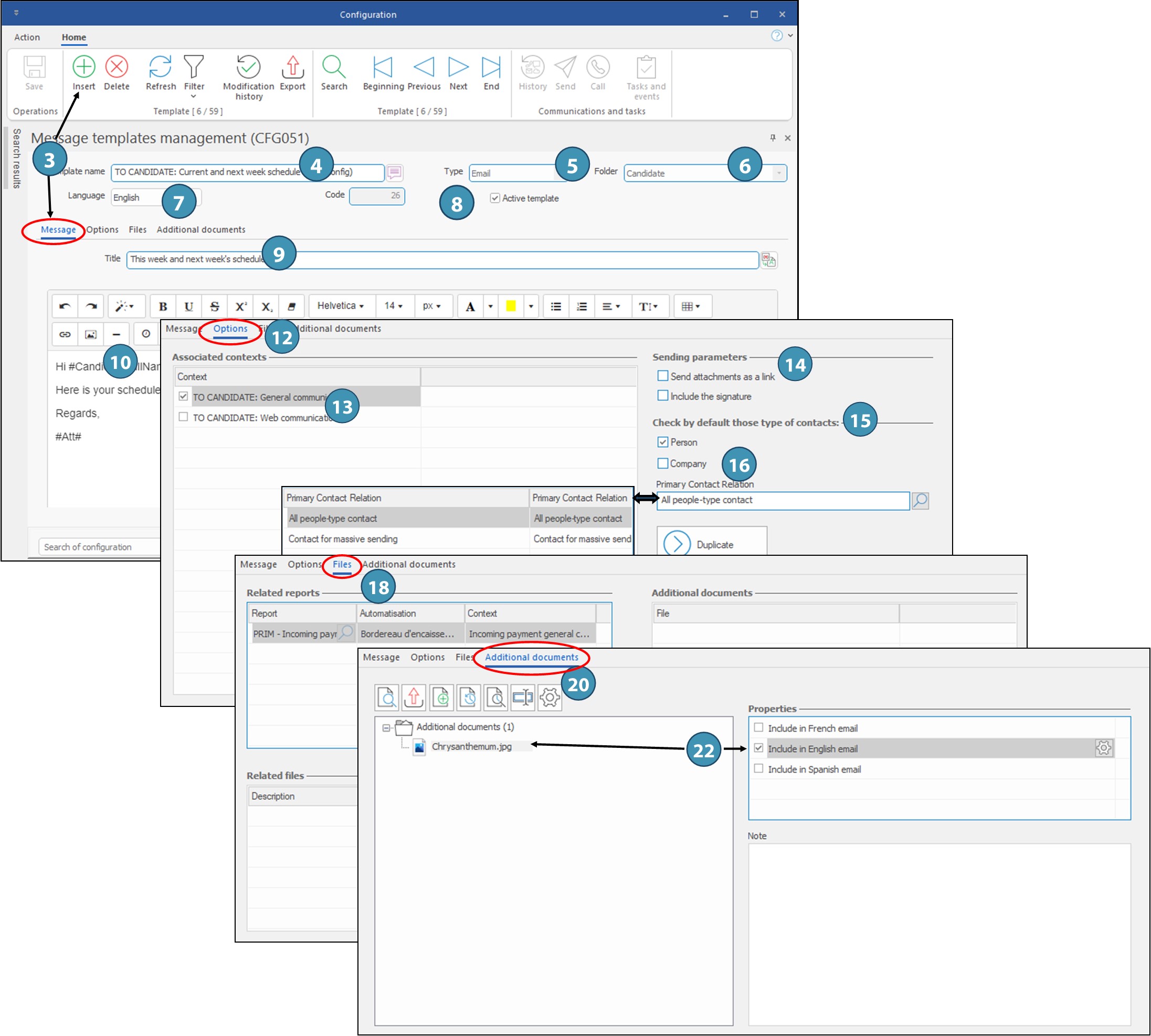 1.Open the window ''Message template management''. 2.If needed, hide the "Search results" pane to optimize the window. 3.Under the ''Message'' tab, click on 4.Enter the name of your new template. 5.Select the template type ''Email'' in the list of choices. The edition zone of the message is displayed. 6.Select the folder in which you want to add your template. 7.Select the language in which you will compose your message. 8.Tick the box ''Active template'' to allow PRIM users to use your template. 9.Enter the title or the subject of the email. 10. Write your message. 11.Click on 12. Move under the ''Options'' tab. 13. Depending on the selected folder in the section ''Associated contexts'', you will have a list of different contexts. Choose among the proposed items. 14. Select the sending parameters. 15. The section ''Check by default those type of contacts'' will be accessible according to the selected folder at the creation of the template. 16. If needed, check the type of contact that will be ticked by default at the sending of the email and the property which has to be ticked in the file of the contact. 17. Click on 18. Move under the ''Files'' tab if you want to attach a document to the template (a PRIM report or a document saved under the in ''Documents management'' tab). 19. Click on 20. Move under the ''Additional documents'' if you want to join a document saved on your workstation or your network. 21. From the "Home" ribbon, click on 22. Once added, select it, and select the the properties of the file. 23. Click on 24. If you company uses different languages, change the language (7) to compose in a different language. 25.Your message is ready. You will be able to use it at your next email sending, using the button