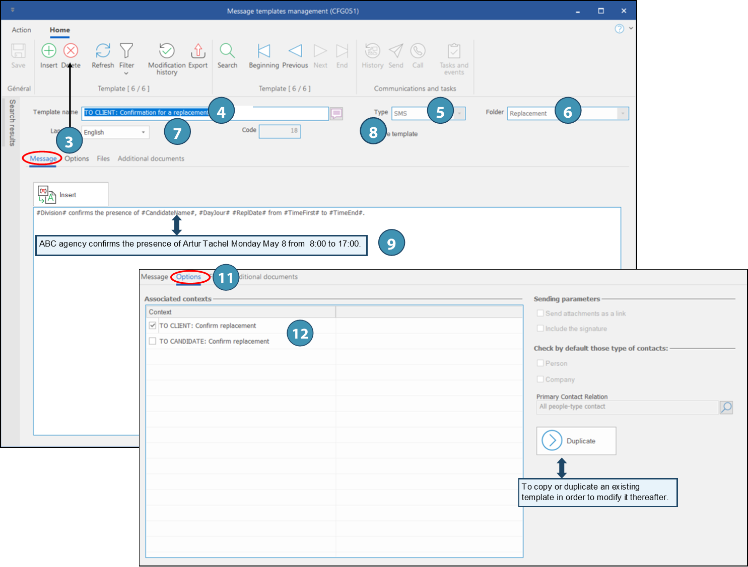 1.Select the template you want to duplicate and modify in Search results, or using the icons 2.Go to Options tab. 3.Click on Duplicate. 4.You will be asked if you want to duplicate the template, and then if you want to select the new template. Click Yes for both. 5.A copy of the message will be displayed, with "Copy of" at the beginning of the message's name.