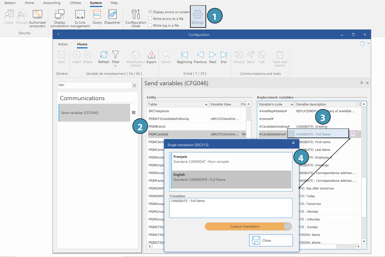 1.In the "System" ribbon, click on "Settings" to open the configuration window. 2.Perform a search (for example : variables) to get the window for management of Send variables (CFG046). The variables are lassified by entity (left table): move on the desired entity. 3.Look in the table on the right for the variable that you want to rename. 4.Use the translation button to rename the variable according to your preferences and save.