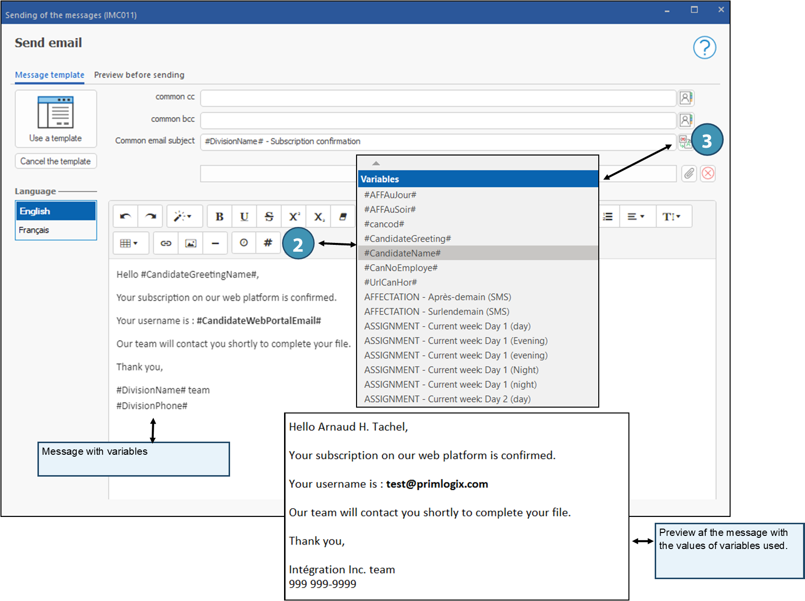 See sections "Add an email template un modèle de courriel" and "Add a SMS template" to learn how to create templates. Nous traiterons ici de l'ajout de variables dans un message, although the feature is the same in a template.
