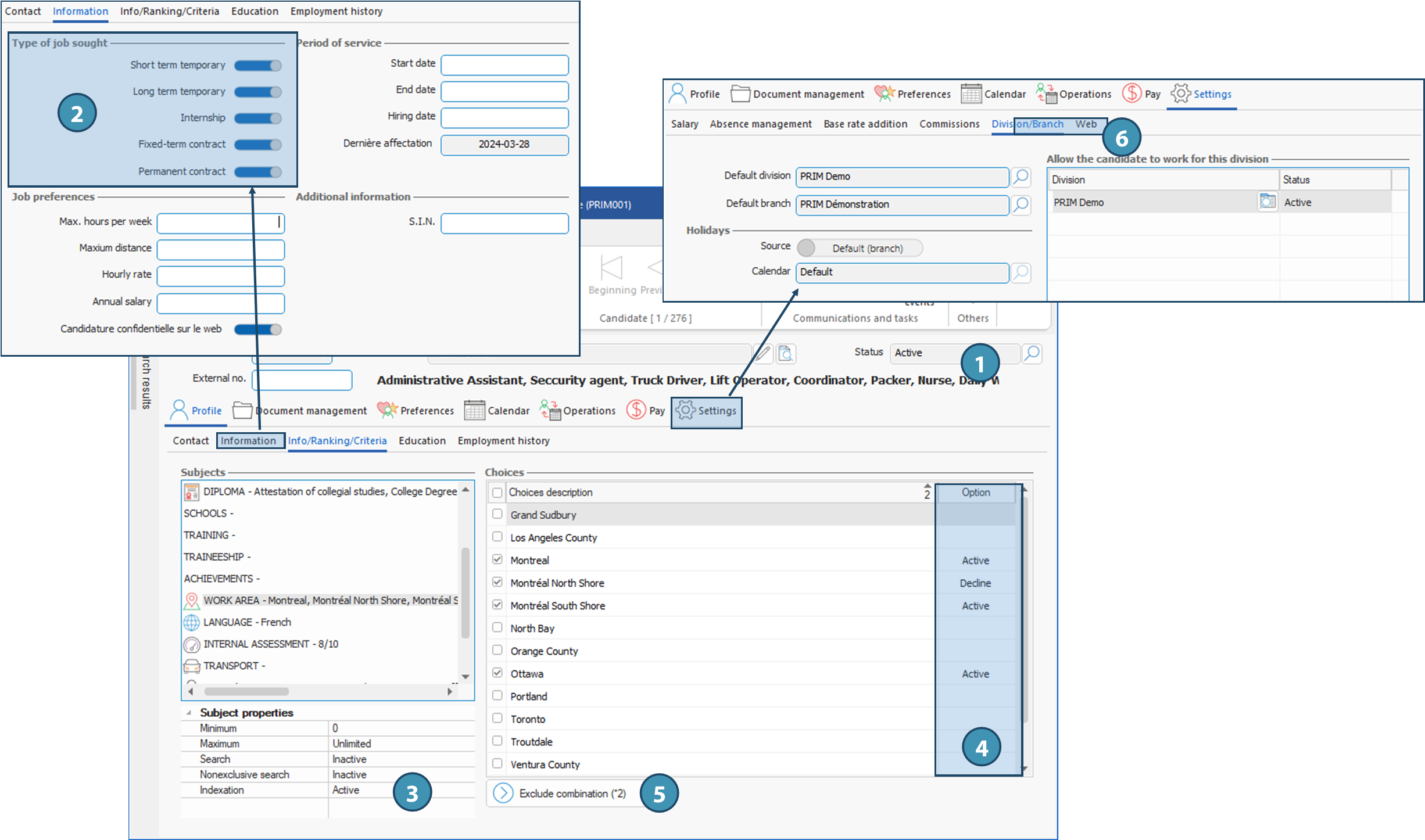 6.In tab Settings / sub-tab Division/Branch, make sure the candidate is allowed to work for the division associated to the request.