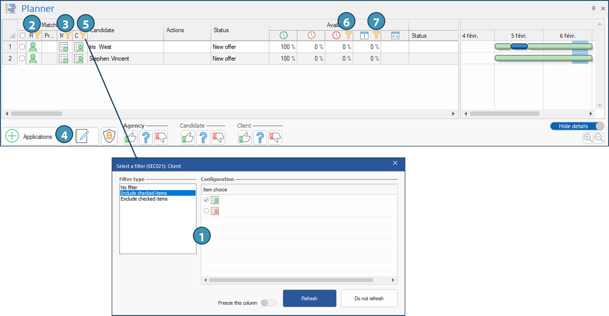 Although a filter is applied to the mission criteria, removing this filter will not result in displaying candidates who do not meet these criteria, since they are considered mandatory. If a candidate who should meet all the criteria does not appear despite the removal of all the planner's filters, we suggest you check ticked criteria in the candidate's file, the excluded combinations, the required or declined criteria, to compare them with criteria of the mission, and correct the candidate's criteria if necessary. You can also add the candidate manually by clicking on the button "Applications" (4). If the candidate doesn't meet the mission criteria and the filter has been removed, the added candidate will be displayed with the icon