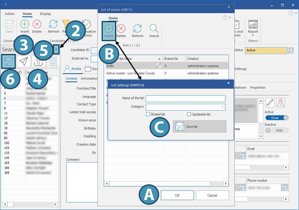 When you create a new list, name it and assign it to a category from the ones proposed depending on your software configuration. Next, decide whether or not this list will be shared with other users of the software and whether it can be updated. Finally, save the list (C)