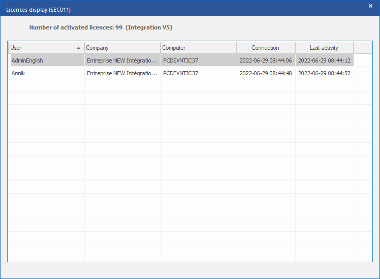 This window allows to view the connections, so you will know which users are connected to PRIM Logix, on which workstation and the date and time of the system connection and the last activity.