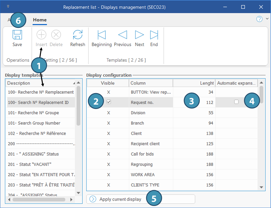 5.If desired, you can rather use the "Apply current display" button: when the display is created, this button copies the configuration currently applied to the window. In this way, the user could adjust the width of each of the columns according to their preferences, then open the window for creating a display and use the button to save the current display as a configured display.
