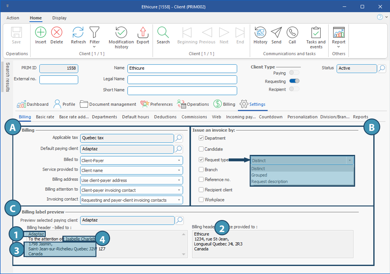 The Billing where to enter the configuration related to billing for a specific client. If this tab is configured correctly, a lot of time will be saved during the various operations, especially during the creation of requests as well as during invoicing. It can be divided into 3 sections: A.Billing: This section comprises all items related to invoicing that needs to be set up, i.e. the payer client, taxes, to whom the invoice is sent and many additional items. B.Issue an invoice by: Comprises the various units that can be used for the breakdown of billing. C.Preview of the billing label