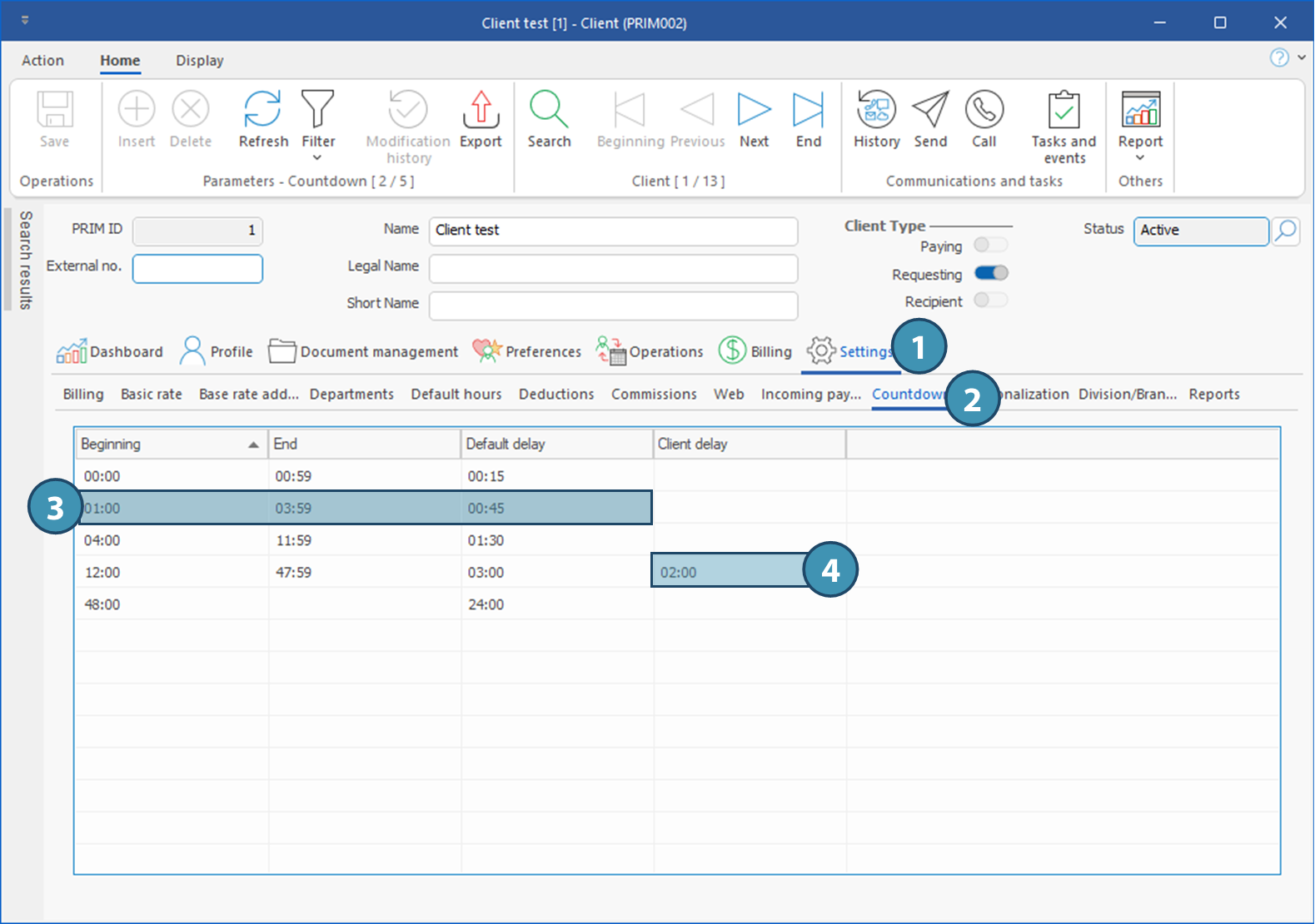The Settings tab allows you to customize information about the client and also to accelerate the data entry when creating requests.