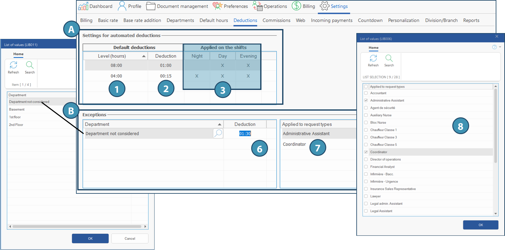 This sub-tab allows you to set up default deductions for the client depending on the shift and total number of hours. Furthermore, for each deduction created the section Settings for automated deductions (A), it is possible to add exceptions depending on the department or request type (B)