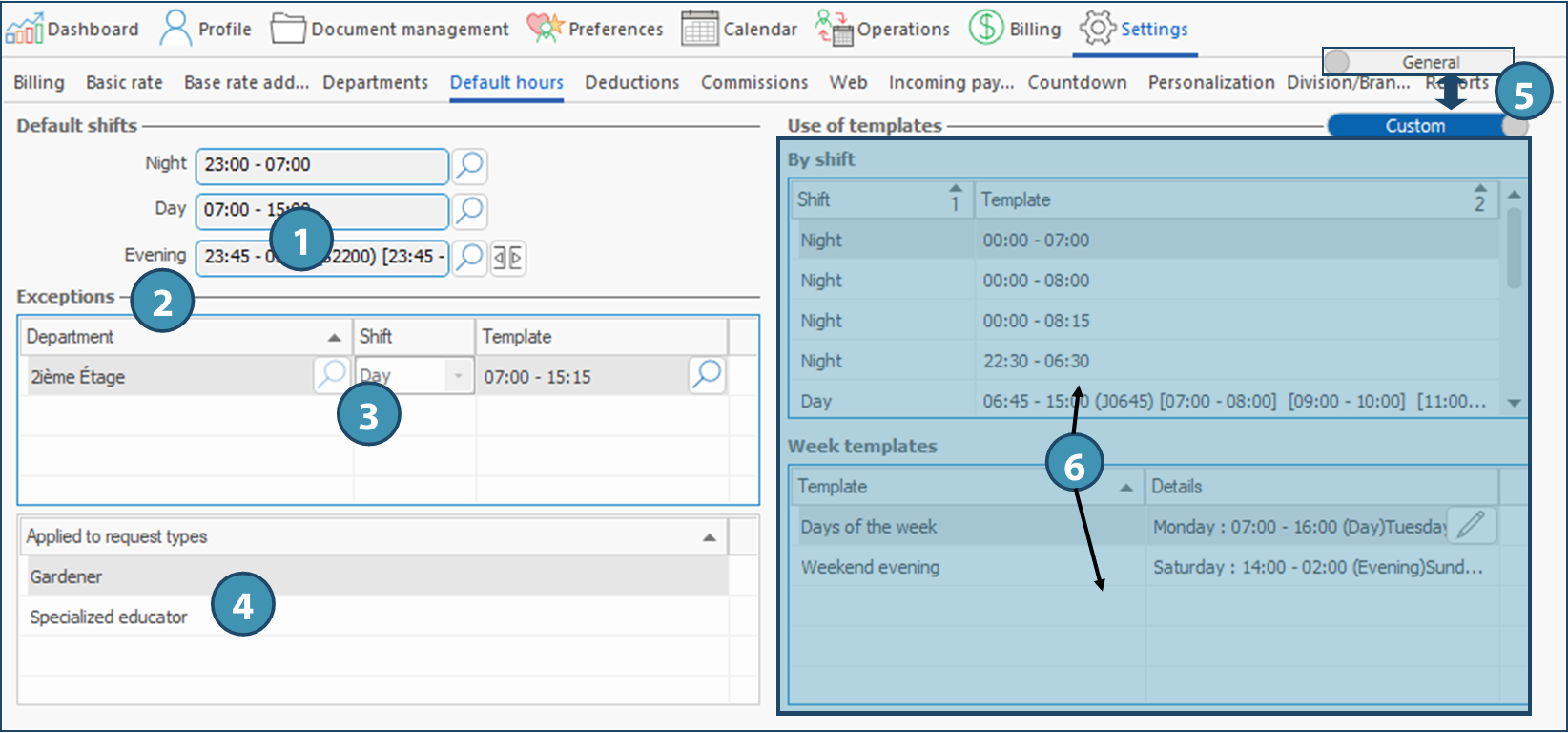 This tab allows you to define the default hours that will be displayed for a shift when creating requests for this client, in order to accelerate data entry. It is possible to customize these hours for each client in the corresponding fields under Default shifts (1).