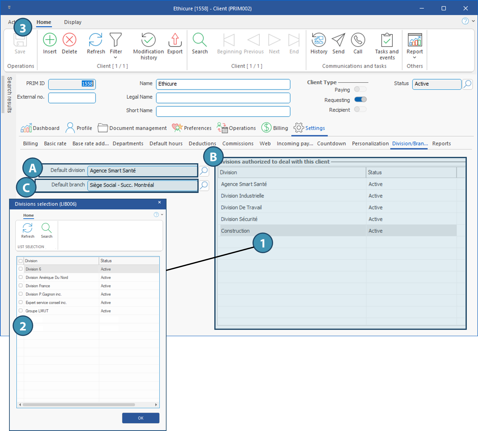 A. Default division: Division that will be selected by default when creating a request for the client. It will still be possible to change it if needed with one of the divisions authorized to deal with the client. Click on