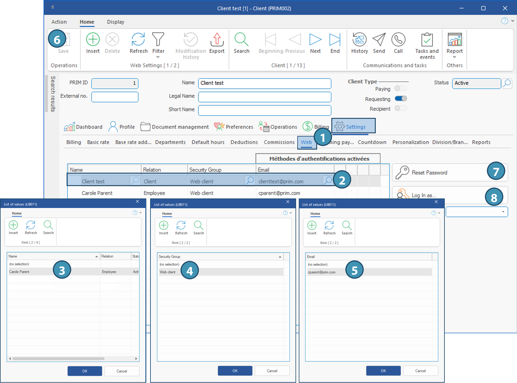 To create additional accounts: 3.Click on a blank line: the List of values window is displayed with all the relations included in the client's file. Choose the employee for whom you want to create an account and click on OK. 4.A second List of values window is displayed, allowing you to select the Web security group. Click on OK. 5.A third List of values window is displayed . Choose the employee's email and click on OK. 6.Click on 7.To reset a password, select the account for which a reset is needed and click on Reset Password. The user will receive an email with a link to click on in order to reset the password. 8.At any time, you can connect to the client Web portal with one of the created account by selecting the line and clicking on the button Log in as...