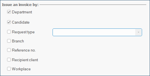 Example #2: If the checkboxes for Department and Candidate are ticked, PRIM will create a separate invoice by department AND candidate for this client. .