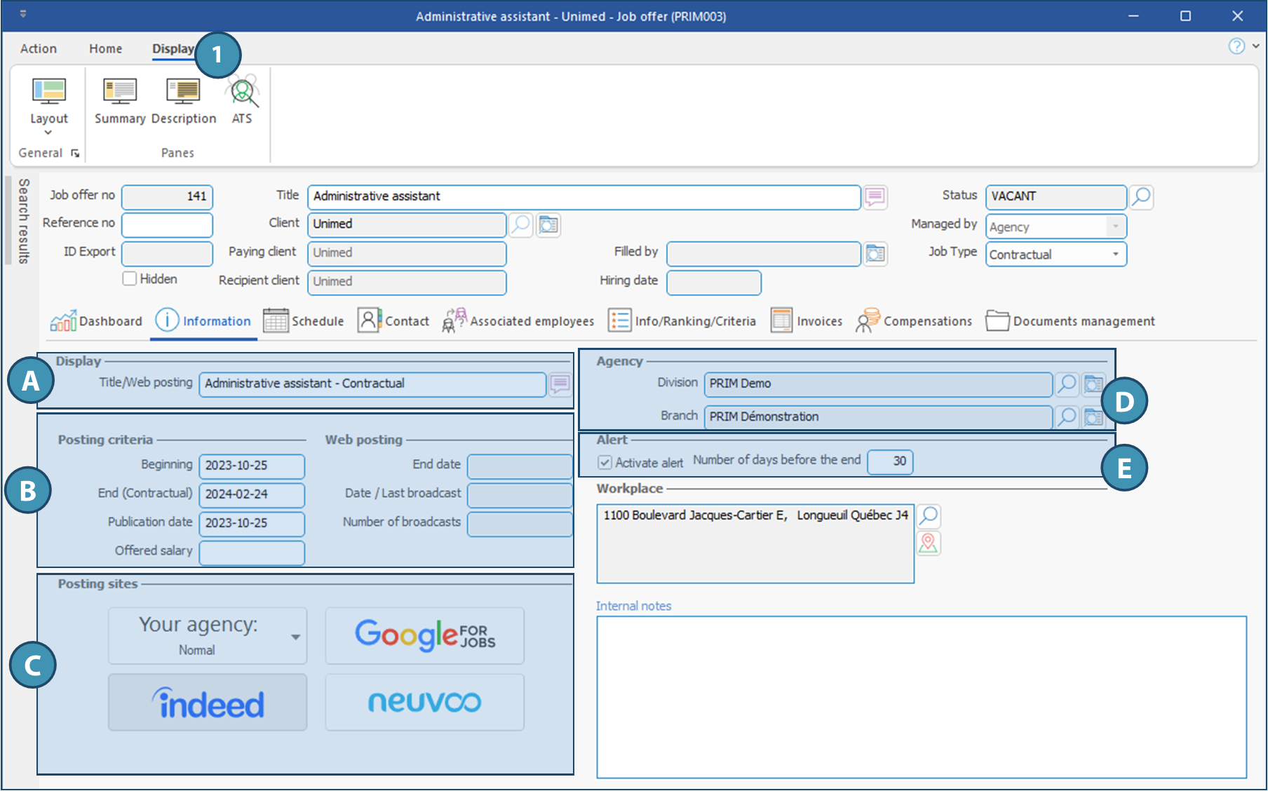 The summary and the complete description of the job offer as it will be displayed on various job boards will be in the "Summary" and "Description" floating panes, that can be opened from the "Display" ribbon of the window (1).