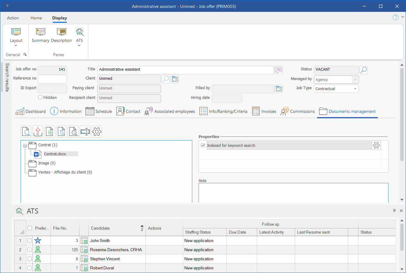 Under this tab, you will find all the documents that have been added in the file of the job offer, for example the complete description or the contract.