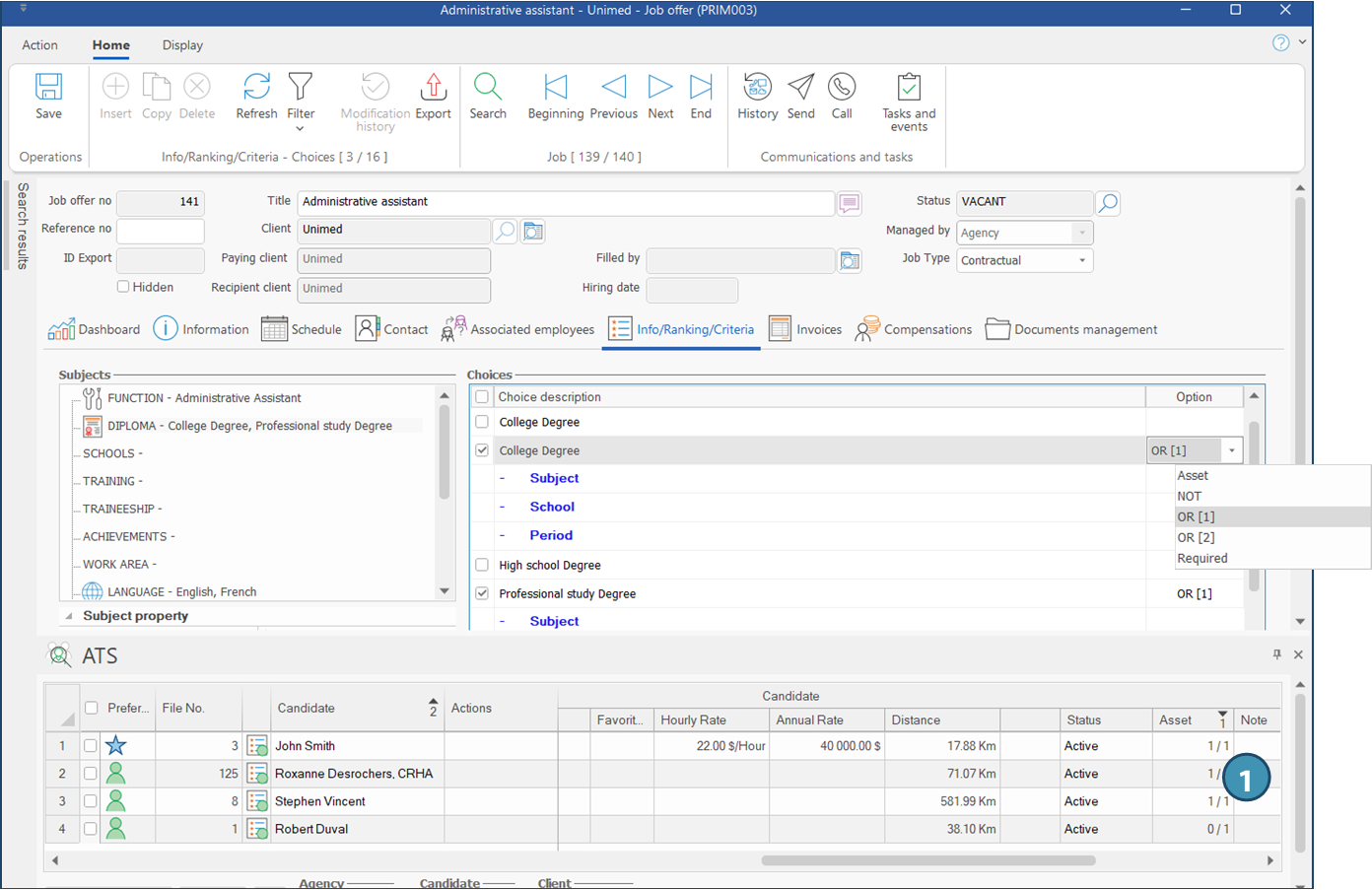 Asset : The candidates who did not tick this option will be displayed in the list. The number of assets of each candidates in regards to the job criteria is displayed in the column Asset (1) in ATS.