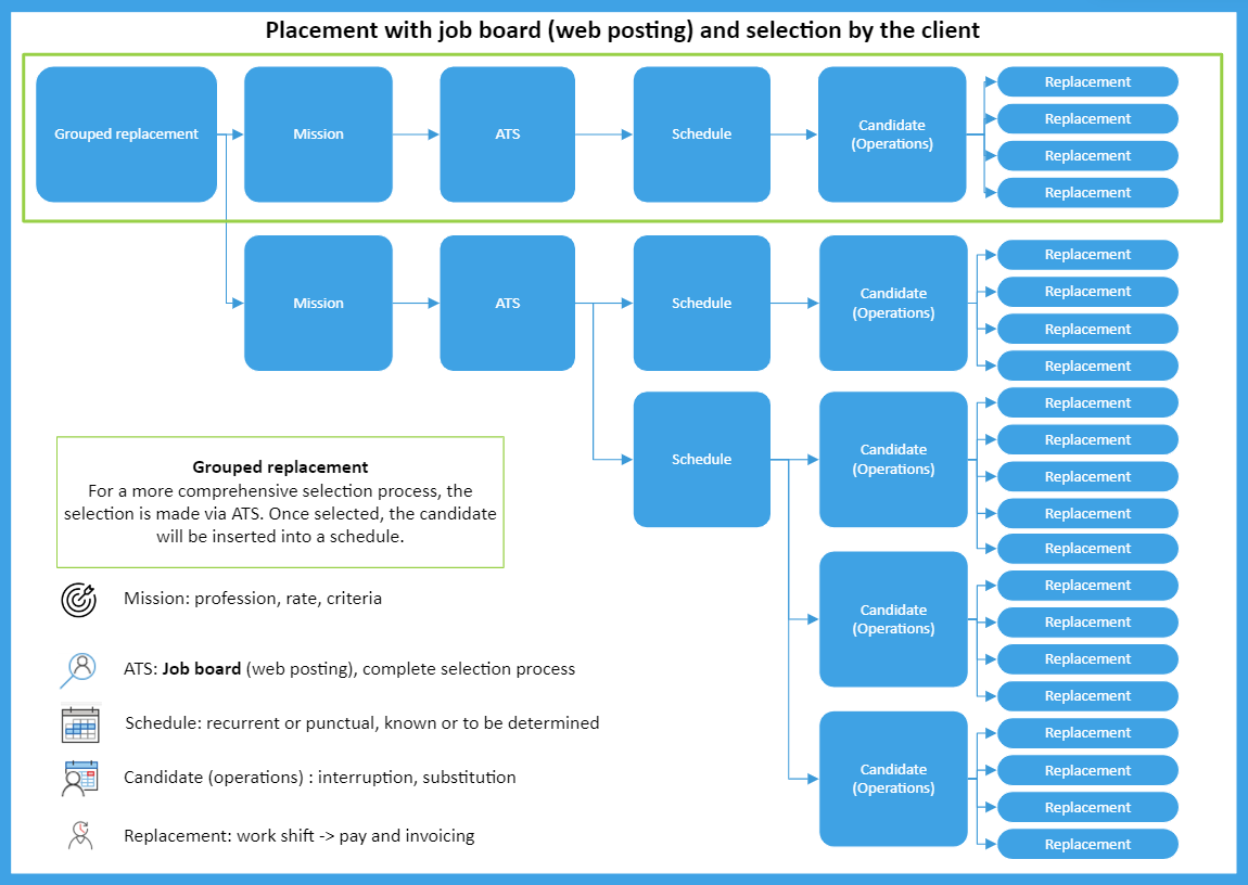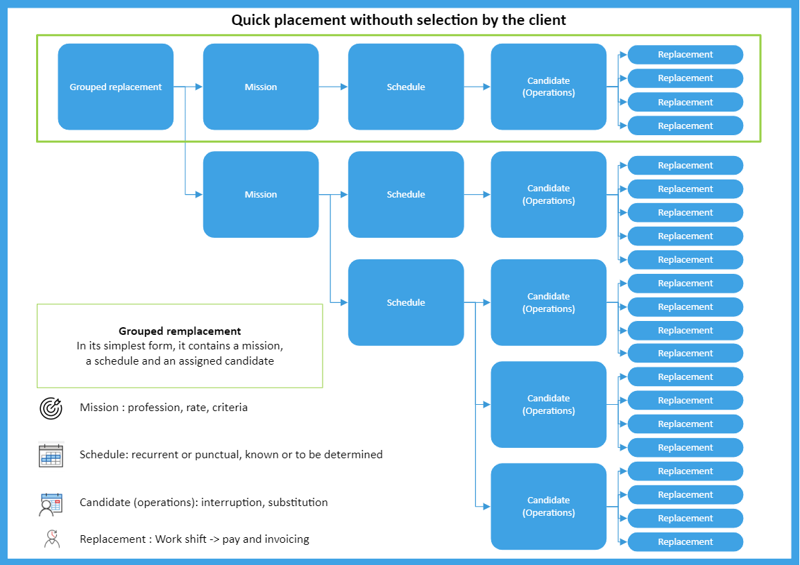 A mission is defined by the type of job. A grouped shifts request can thus include several missions corresponding to as many types of jobs.