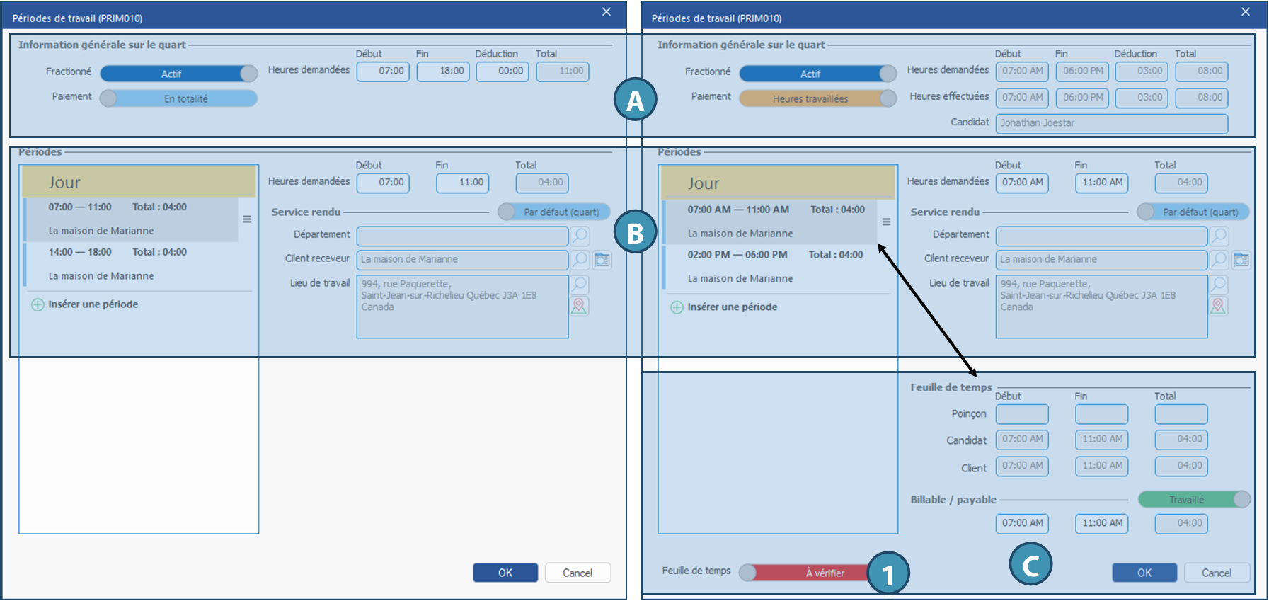 •Shift (PRIM014) : if the division authorize the split, the button is found in section Service provided, to the right of hours worked and in the tab Informations, in Shift section, to the right of requested hours.