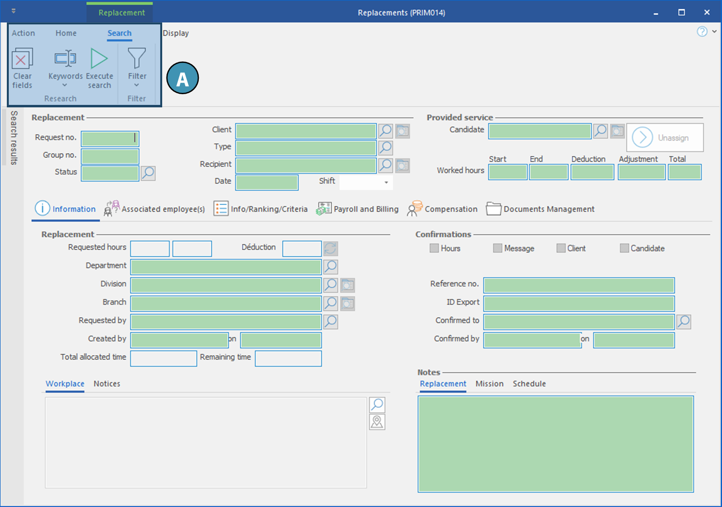 When opened from the "Home" ribbon, the window is displayed in "Search" mode (A). However, if you open it from the "Shift details" button, the window displays directly the selected request.