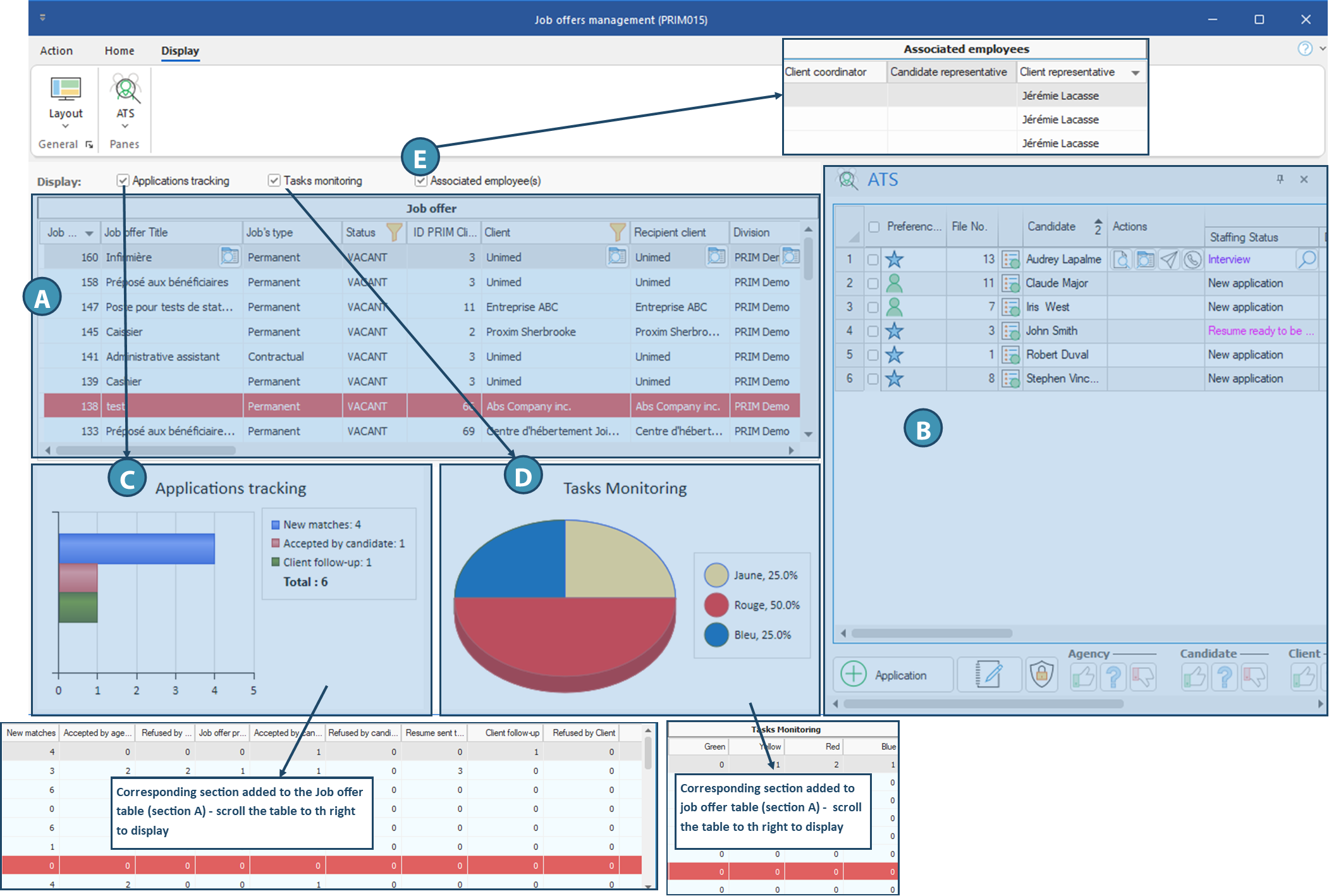 D.Tasks monitoring: Tick the check box Tasks monitoring to add the corresponding section, which is a graphic representation of active tasks relating to the job offer and their status in regards to their deadline (no date, late tasks, current tasks, future tasks). Some columns are also added to the job offers table (section A). Just scroll the table to the right to see the columns.