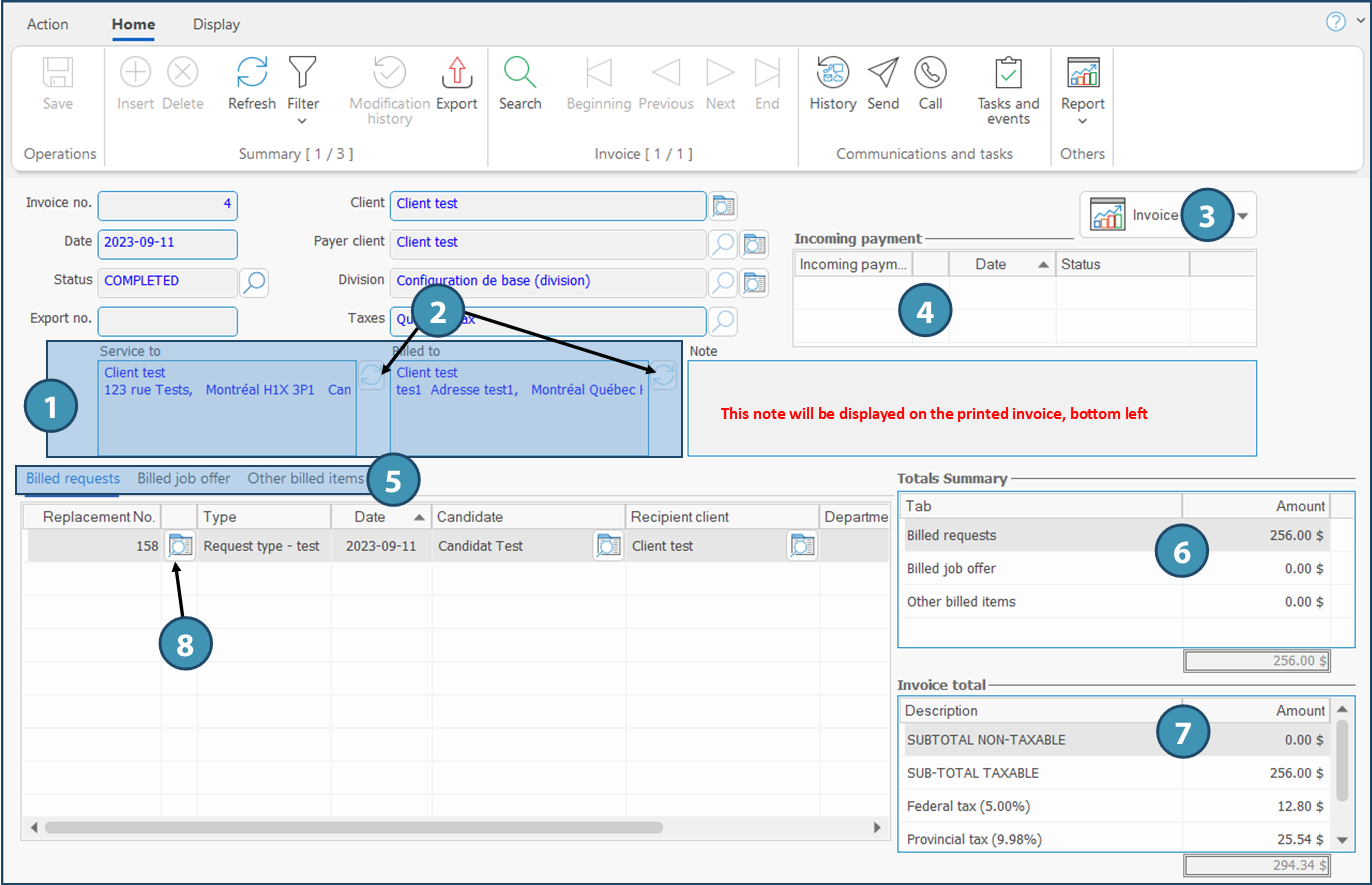 Invoice button (3): To print, view the invoice or send it by email to the client, the status of the invoice must be "Completed" or "Sent".