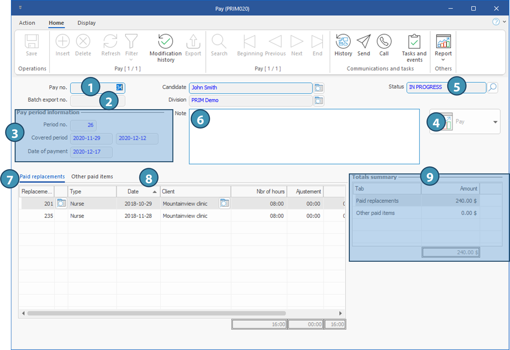 This window contains all the information regarding the selected pay. It is accessible from the Payroll management window or from a Candidate window.