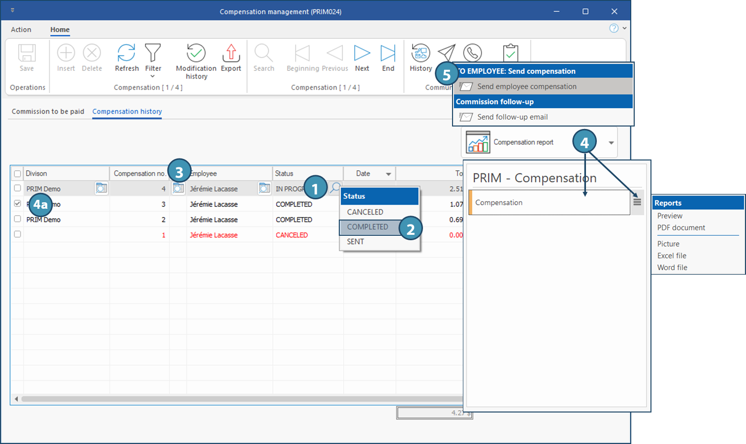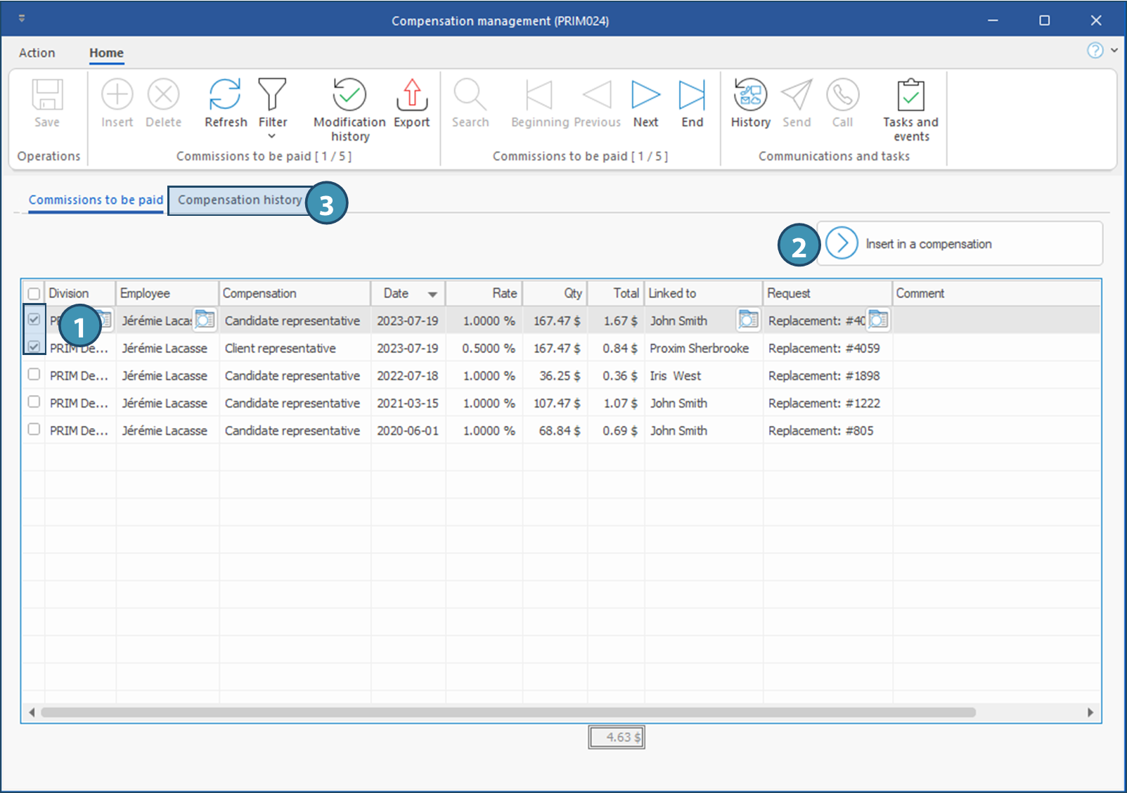 This window allows the consultation and the management of commissions or other fees paid or to be paid to the employees of your company.