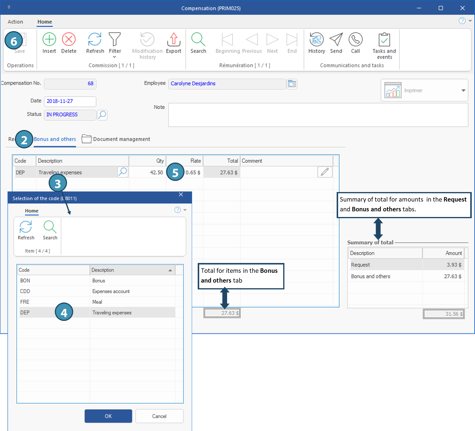 The window "Compensation" displays the details of the selected compensation. It can be accessed from 2 windows: