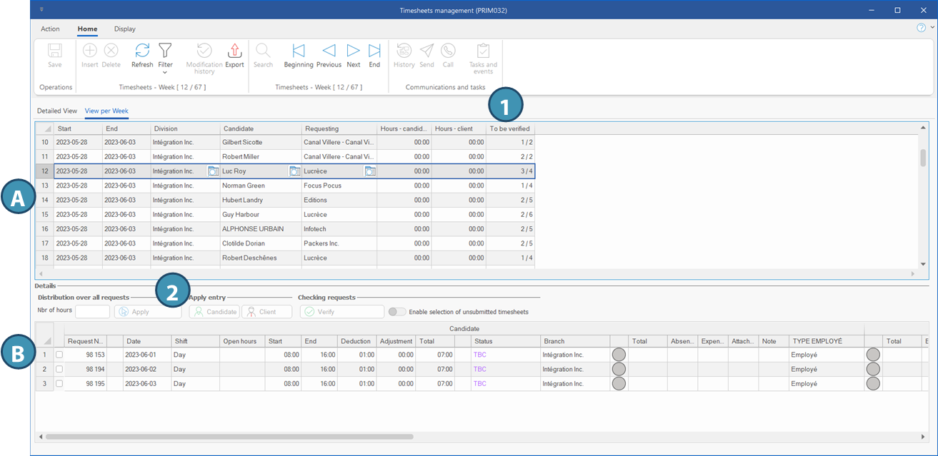 The main table (A) displays all the weeks for which there is one ore more timsheets. Each line corresponds to the timesheets linked to a same candidate and client during a week. The column To be verified (1) indicates the number of remaining timesheets to verify in regards to the total number of timesheets in this period. .
