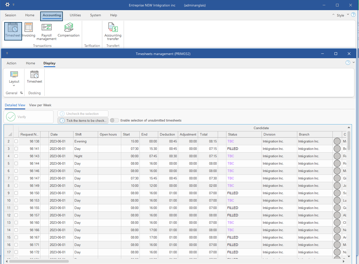 Each line corresponds to a timesheet and displays the general information about the request. From the Display ribbon in the window, the user can launch the Timesheet pane to view the details of the selected timesheet in the table (see page The Timsheets pane).