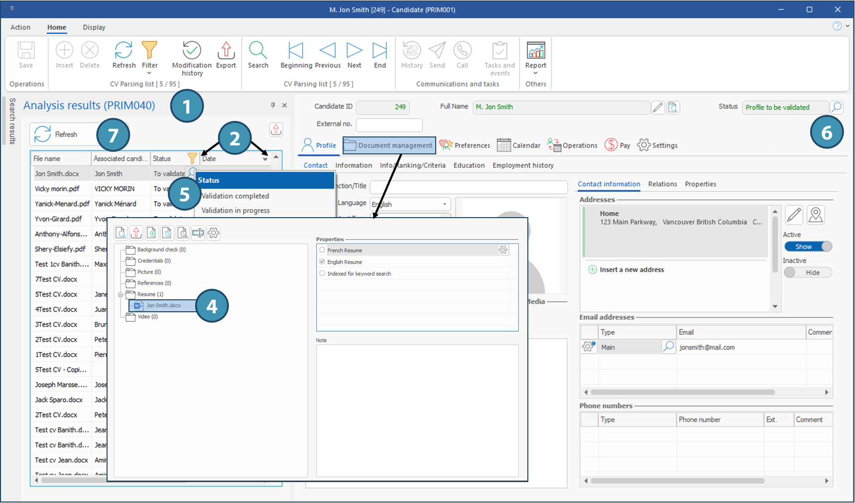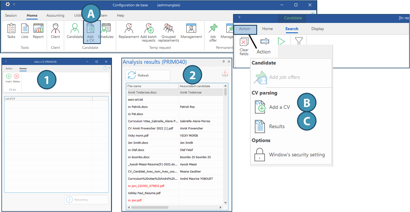 •Add a CV (1), that can be accessed in the Home ribbon of the main PRIM window (A), and from the Action menu of the Candidate window (B). This is where you can launch the analysis of one or several resumes.