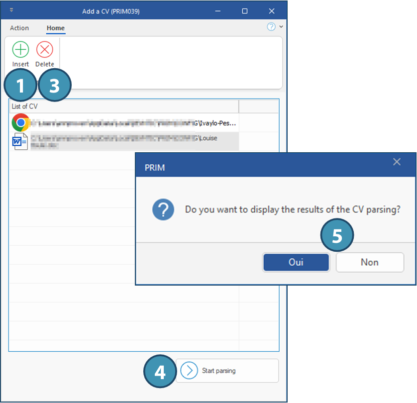 The window Add a CV allows you to add an analyze a resume. For example, a resume received by email and saved on your PC. From the Home ribbon of the main PRIM window, click on