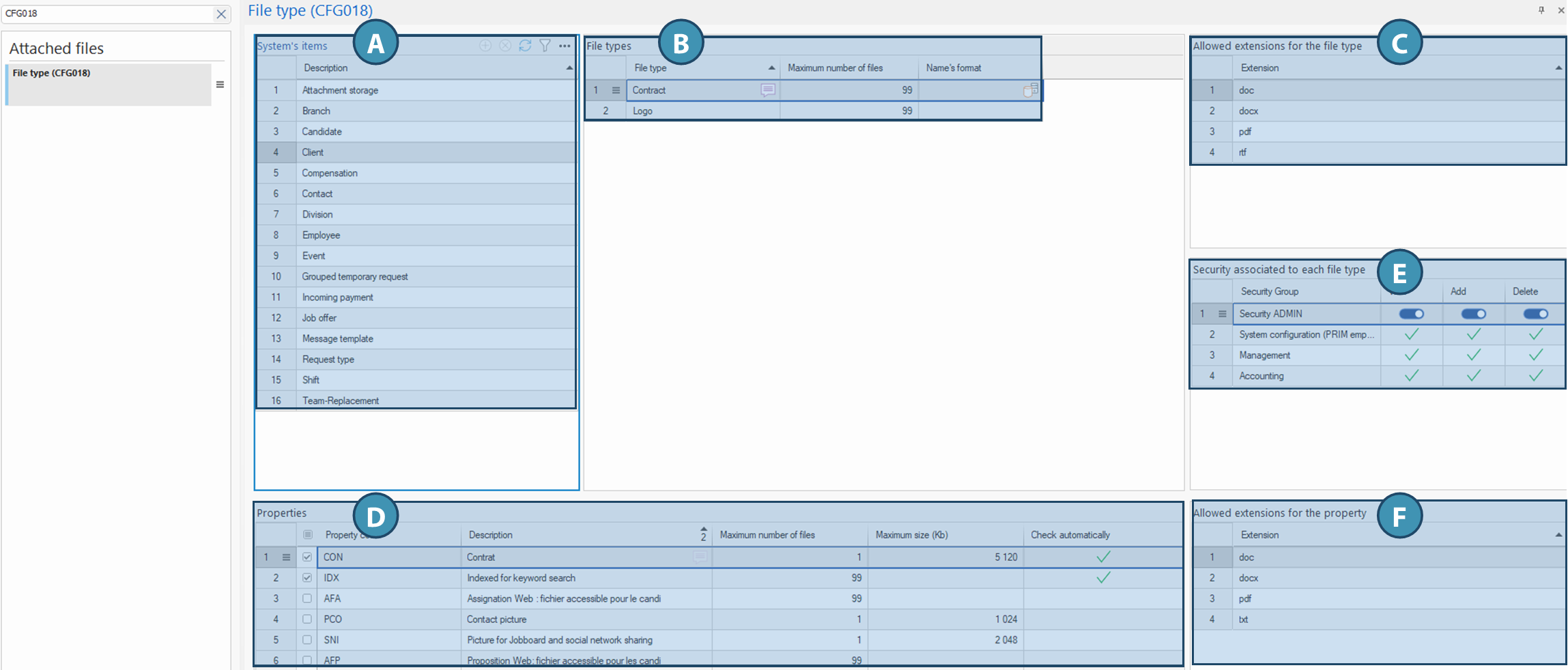 In this area, you can create file categories according to their use (e.g. Resume, Cover letter, Photo) for the table or entity selected in area A. These categories correspond to the folders available in the entity's document management tab.