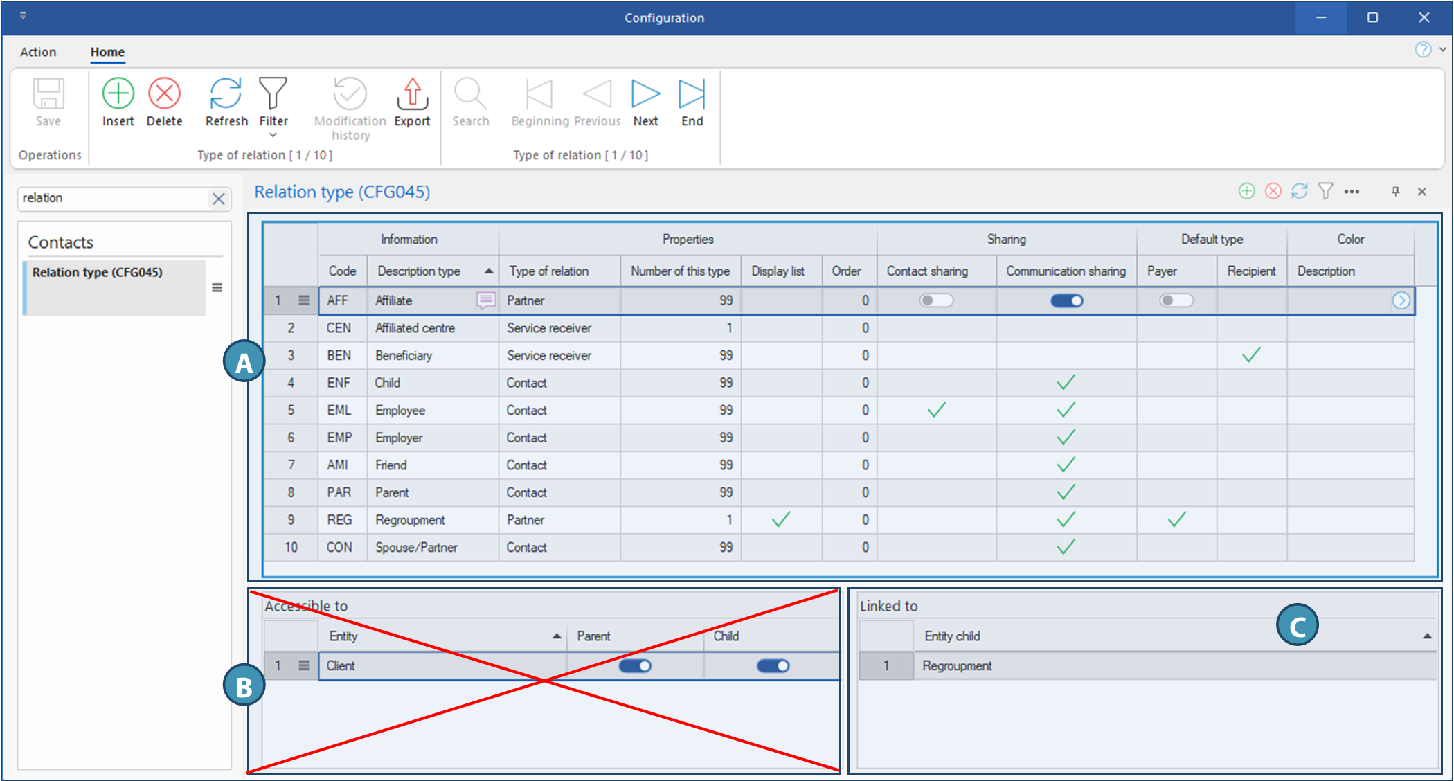 •Relationship type: Property defining the type of relationship: Contact, Service receiver or Partner.